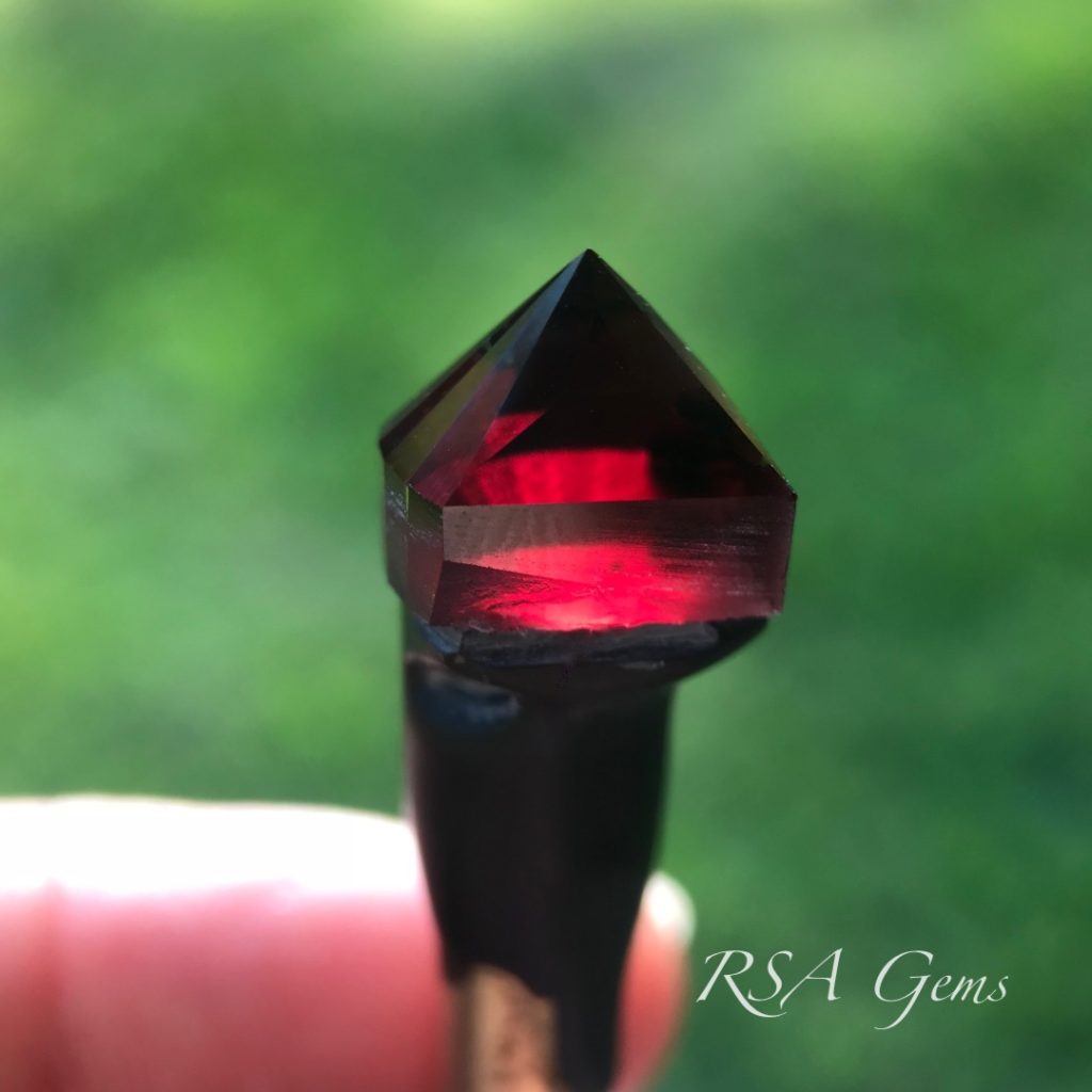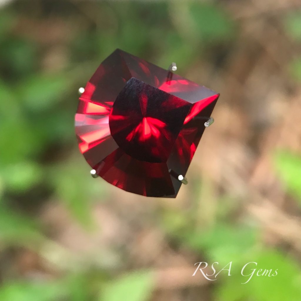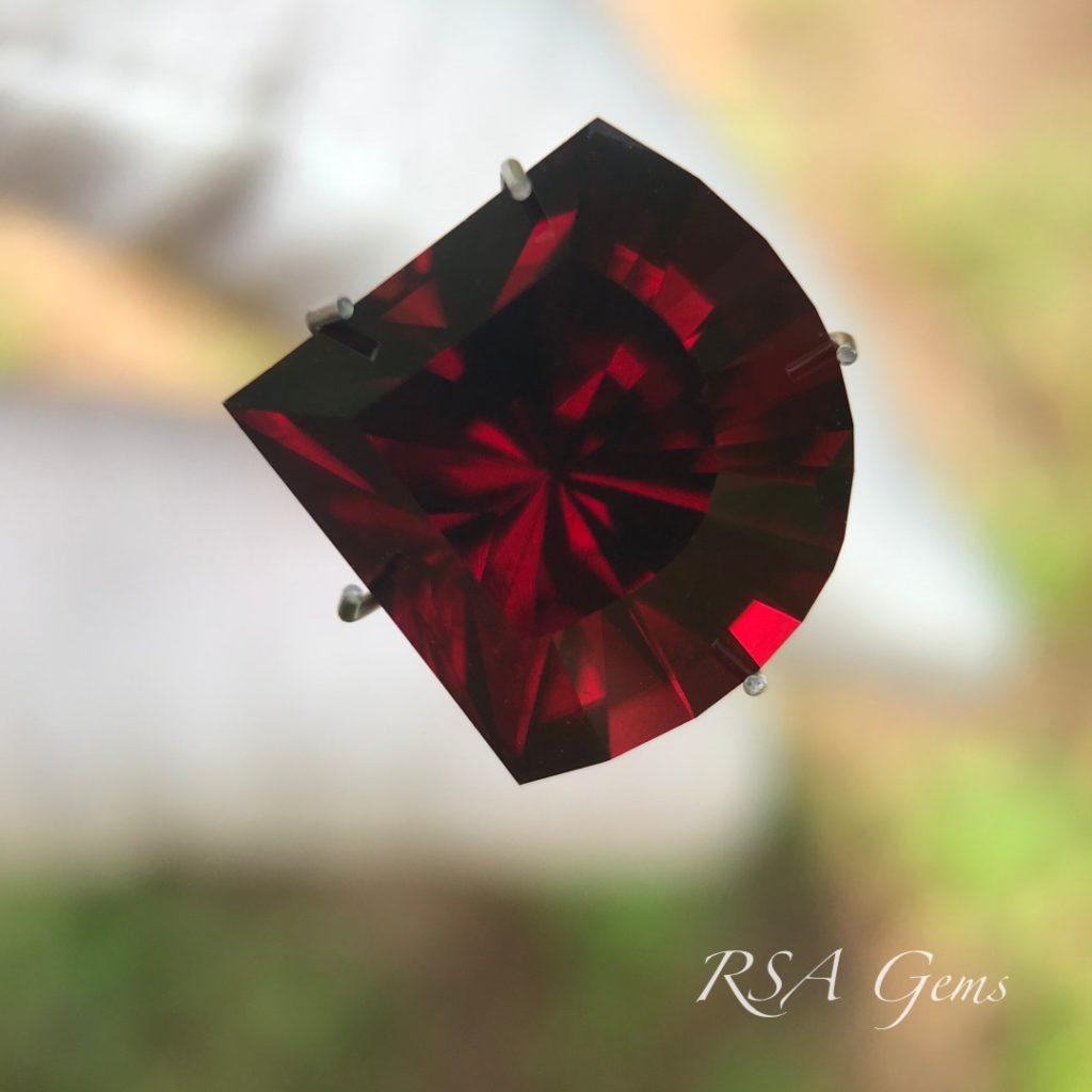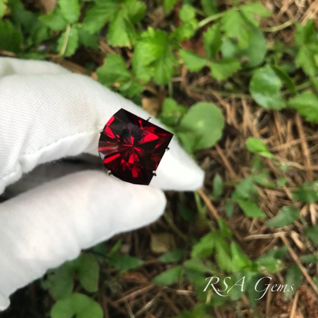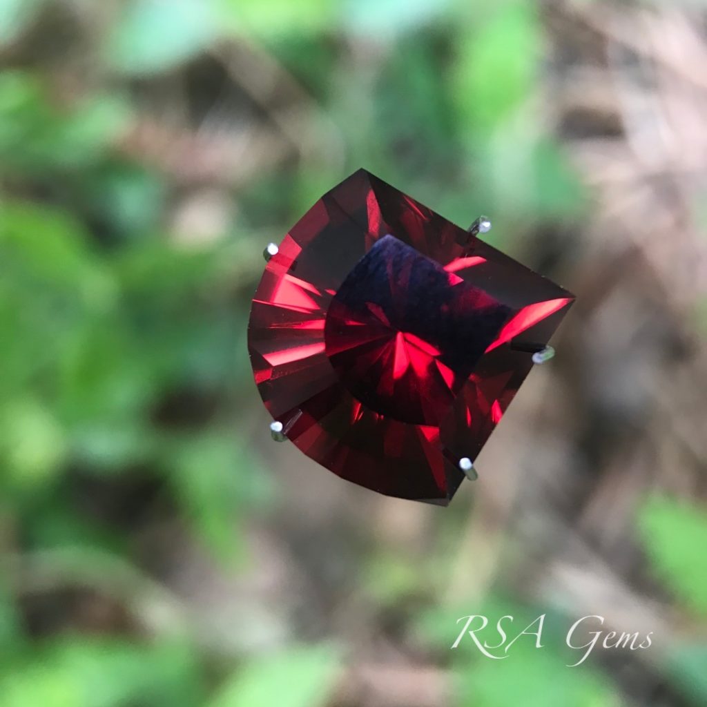 This blood red pyralspite Malawi garnet is very high quality and fairly new to the market. It has high color saturation for a dark stone and really looks fantastic outdoors or in bright indoor lighting.