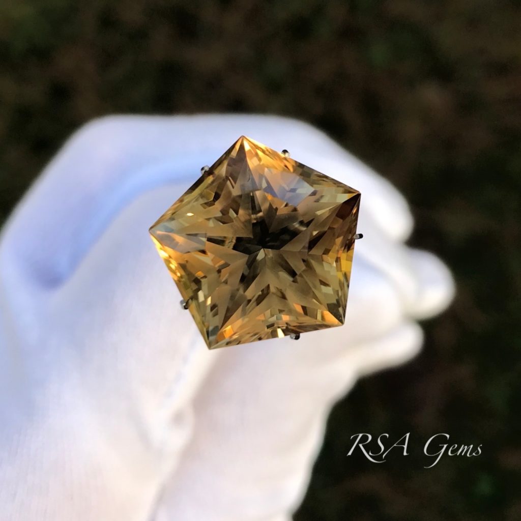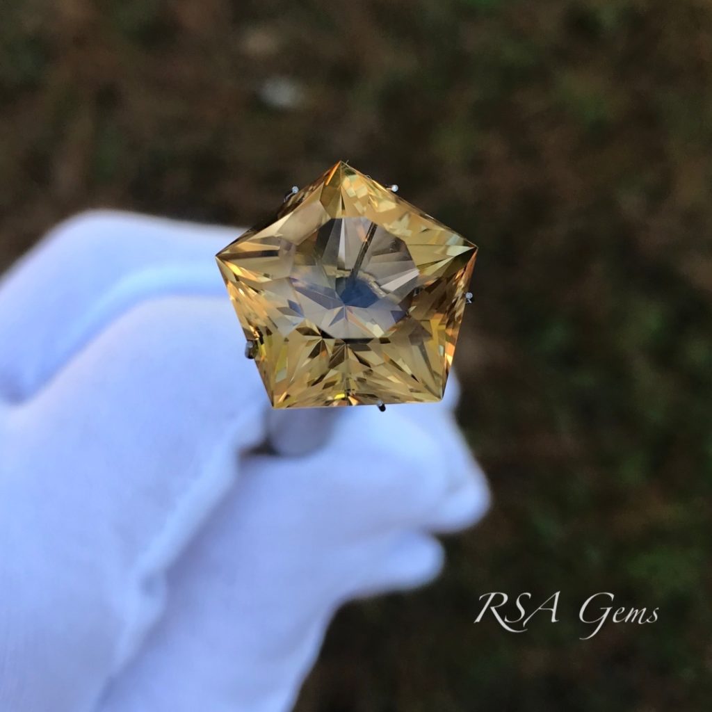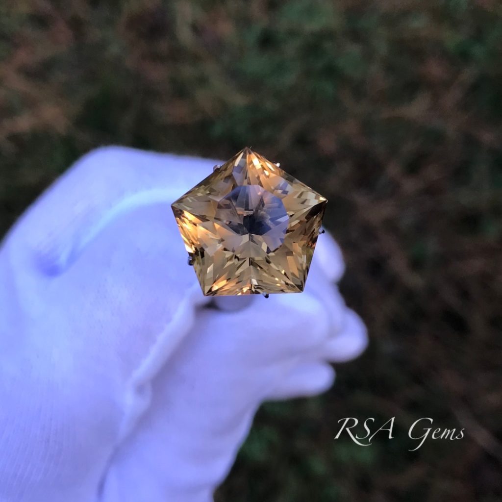 Citrine, the November birthstone, is one of the few gemstones that you can own in large sizes for a few hundred dollars. It is simply abundant comparatively speaking and as such, gemstone cutters use it for practice material, to try out new patterns prior to cutting an expensive stone. This one is cut in a pentagon shape with a star in the middle (there are actually 3 stars, but they are difficult to see unless you turn the stone upside down). A very pretty golden stone at an attractive price.