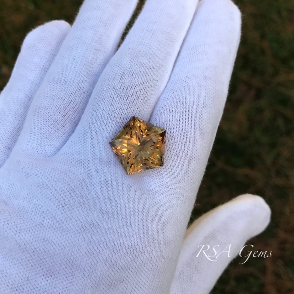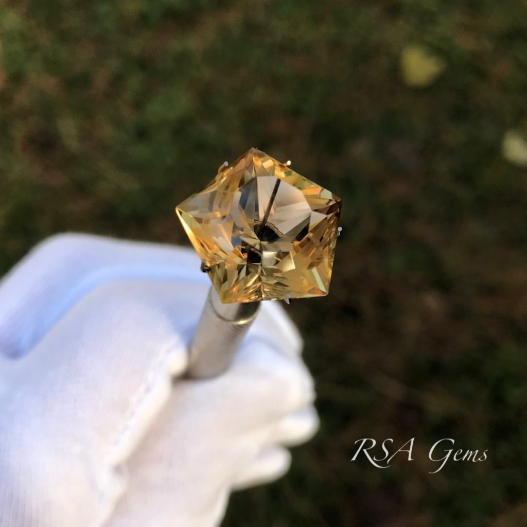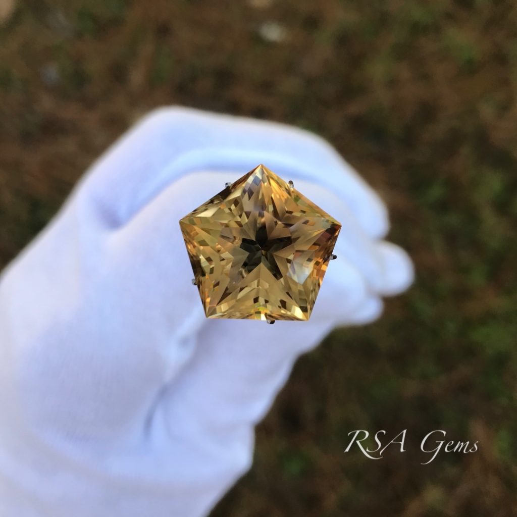 Citrine, the November birthstone, is one of the few gemstones that you can own in large sizes for a few hundred dollars. It is simply abundant comparatively speaking and as such, gemstone cutters use it for practice material, to try out new patterns prior to cutting an expensive stone. This one is cut in a pentagon shape with a star in the middle (there are actually 3 stars, but they are difficult to see unless you turn the stone upside down). A very pretty golden stone at an attractive price.