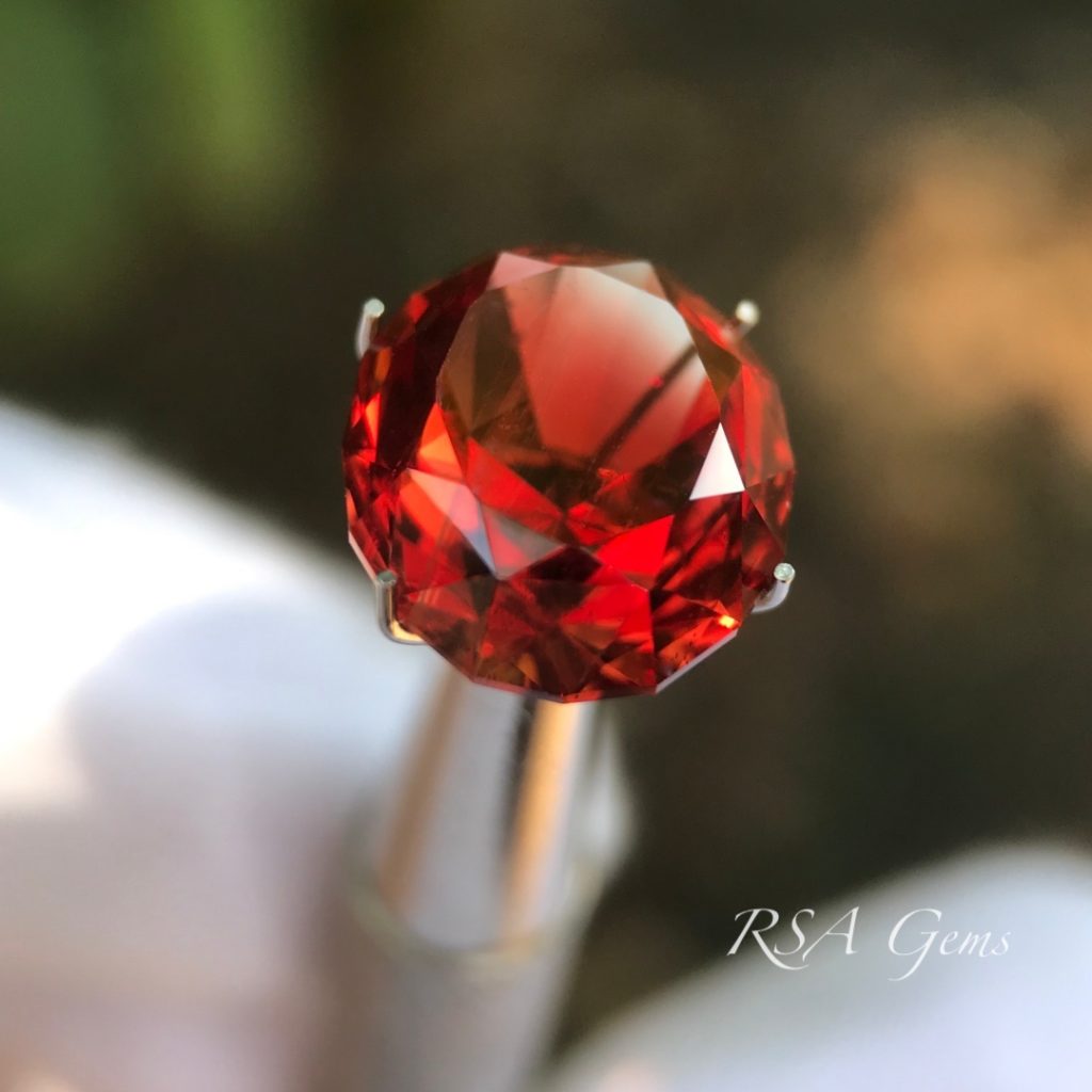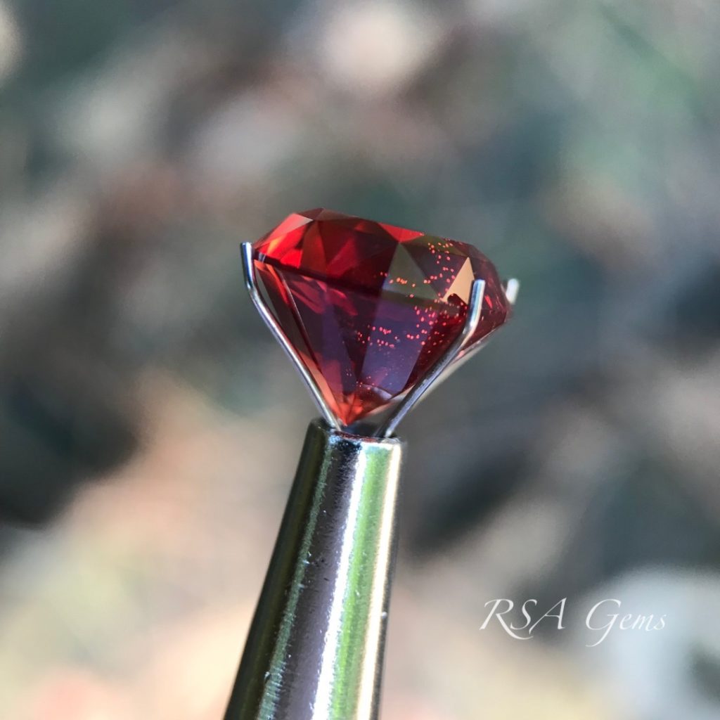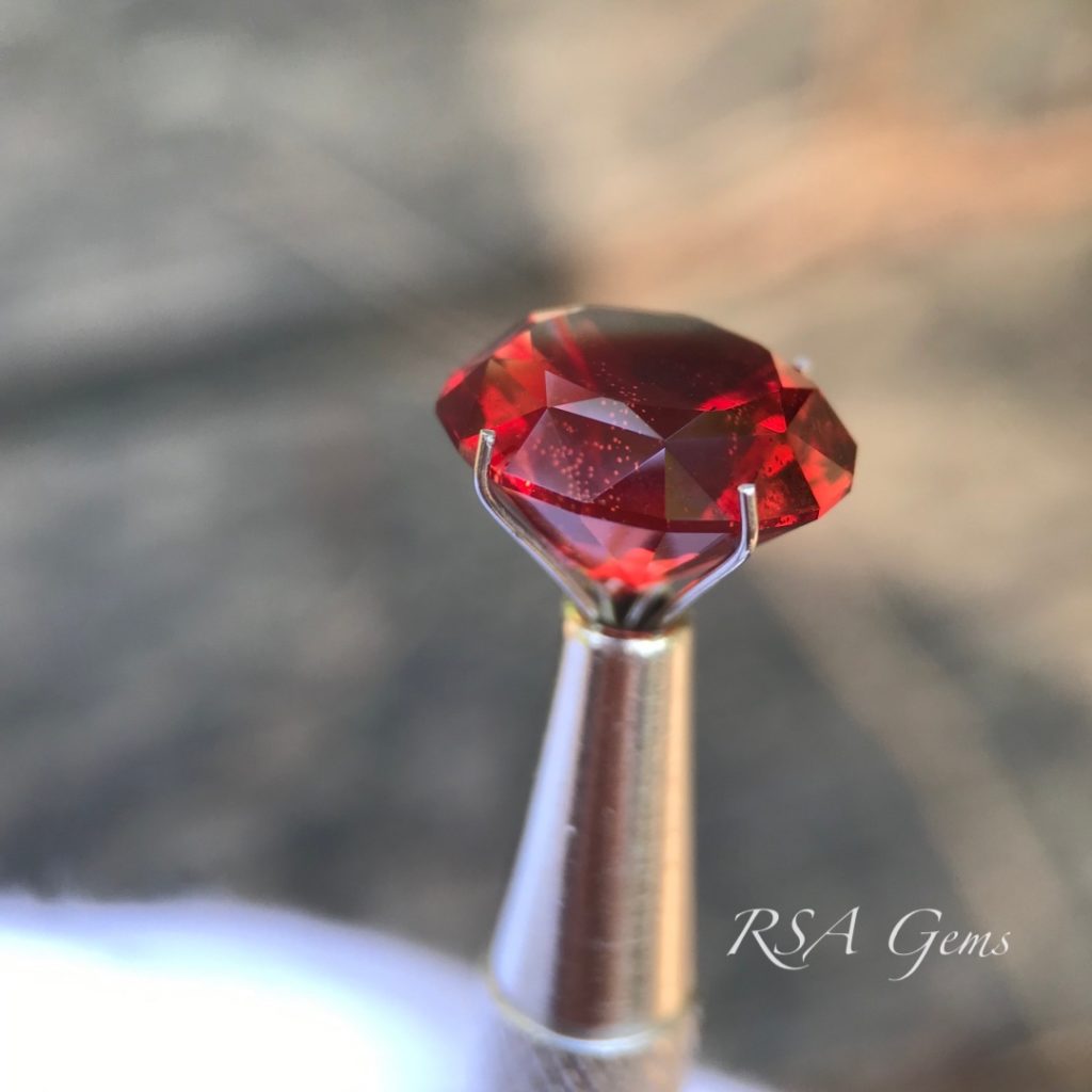 There are six types of schiller (copper inclusions) occurring in Oregon sunstone. This deep red Oregon sunstone has speckles of copper looking like champagne bubbles, especially visible from the side (see photos). Schiller that doesn’t overwhelm the color or clarity of the sunstone, as in this case, combined with the interest it adds, increases the value. Collectors look for this very feature and with color like this, off the charts vivid deep red, it is a true collector’s gem. However, it sure would look great in jewelry too! Precision faceted by Loren Brown in a beautiful design by Robert Long.