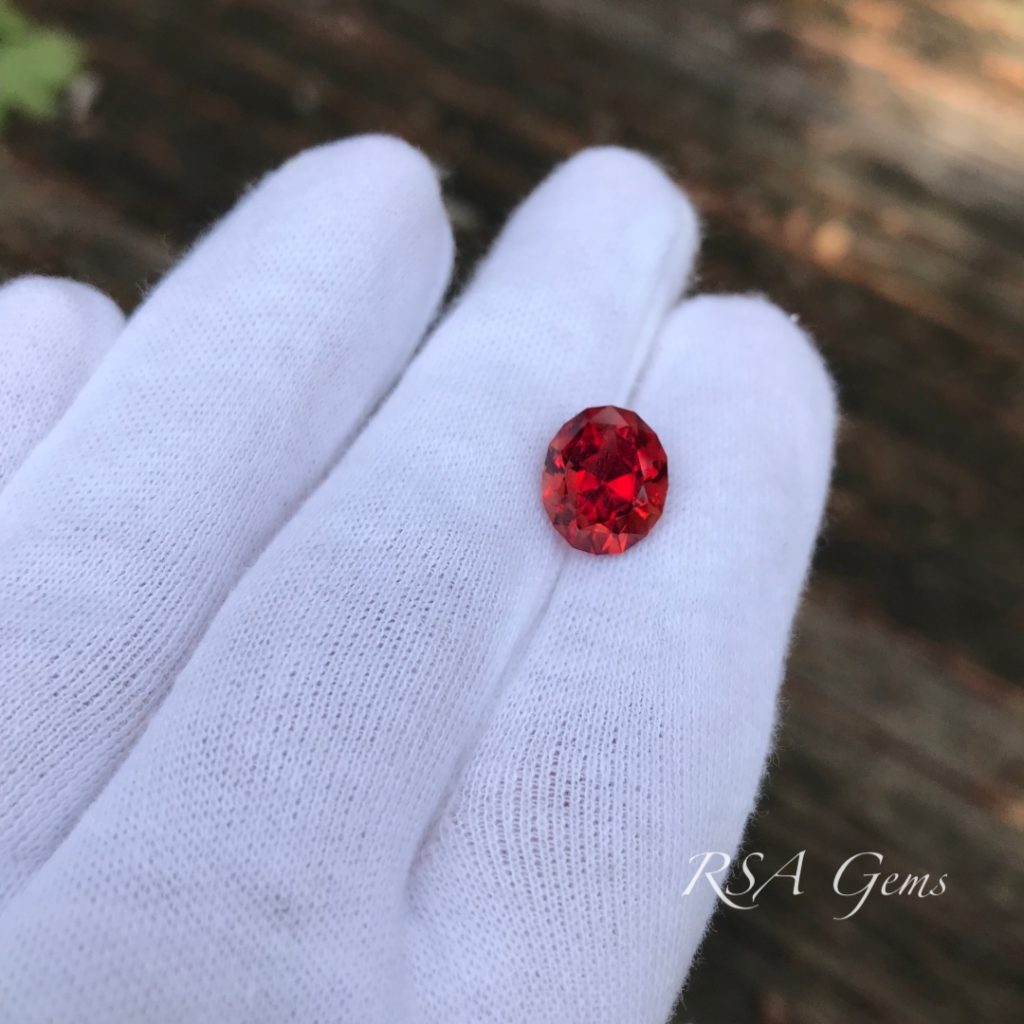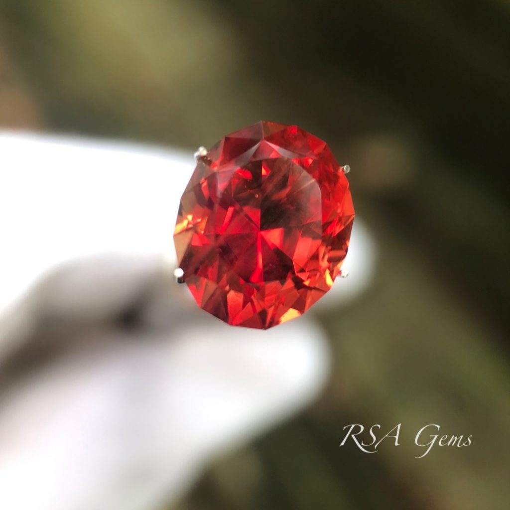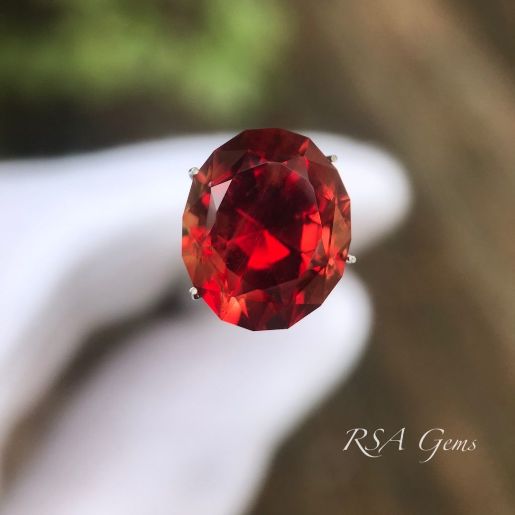 There are six types of schiller (copper inclusions) occurring in Oregon sunstone. This deep red Oregon sunstone has speckles of copper looking like champagne bubbles, especially visible from the side (see photos). Schiller that doesn’t overwhelm the color or clarity of the sunstone, as in this case, combined with the interest it adds, increases the value. Collectors look for this very feature and with color like this, off the charts vivid deep red, it is a true collector’s gem. However, it sure would look great in jewelry too! Precision faceted by Loren Brown in a beautiful design by Robert Long.