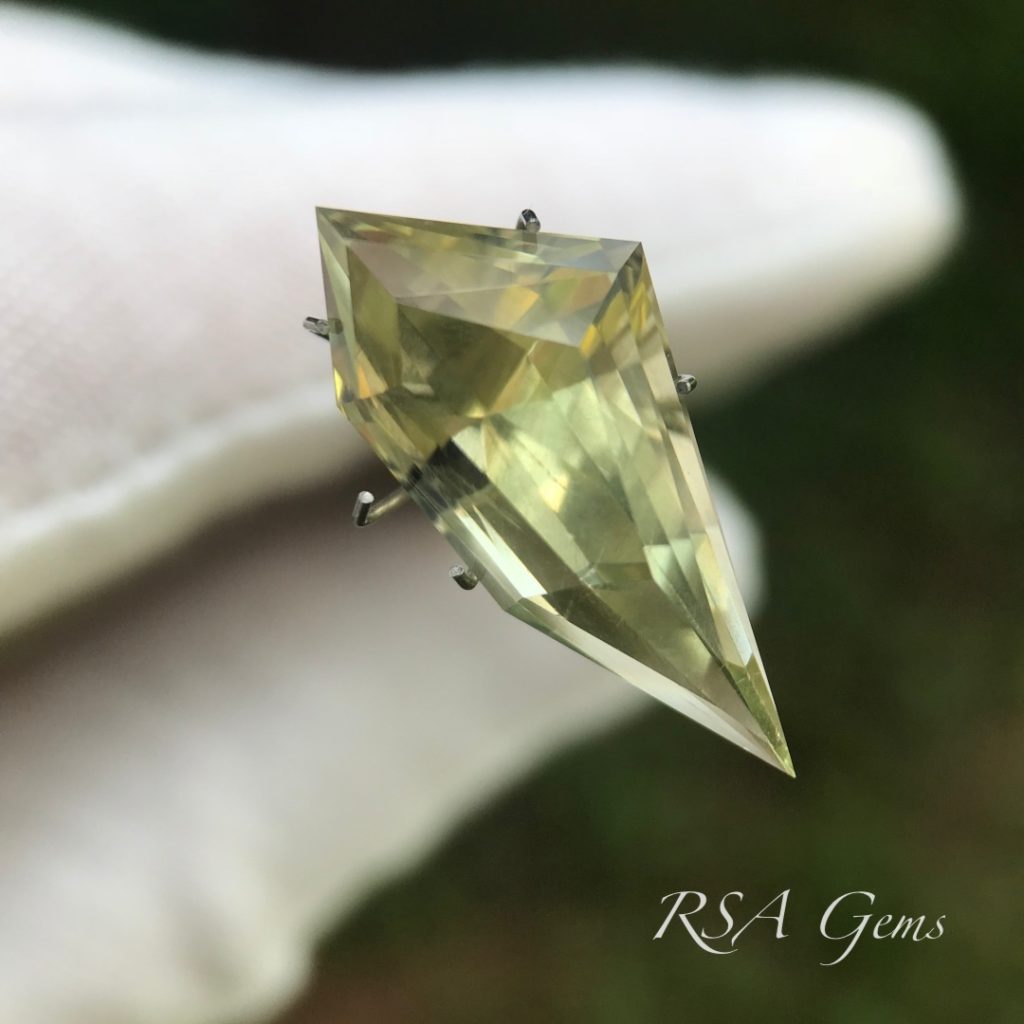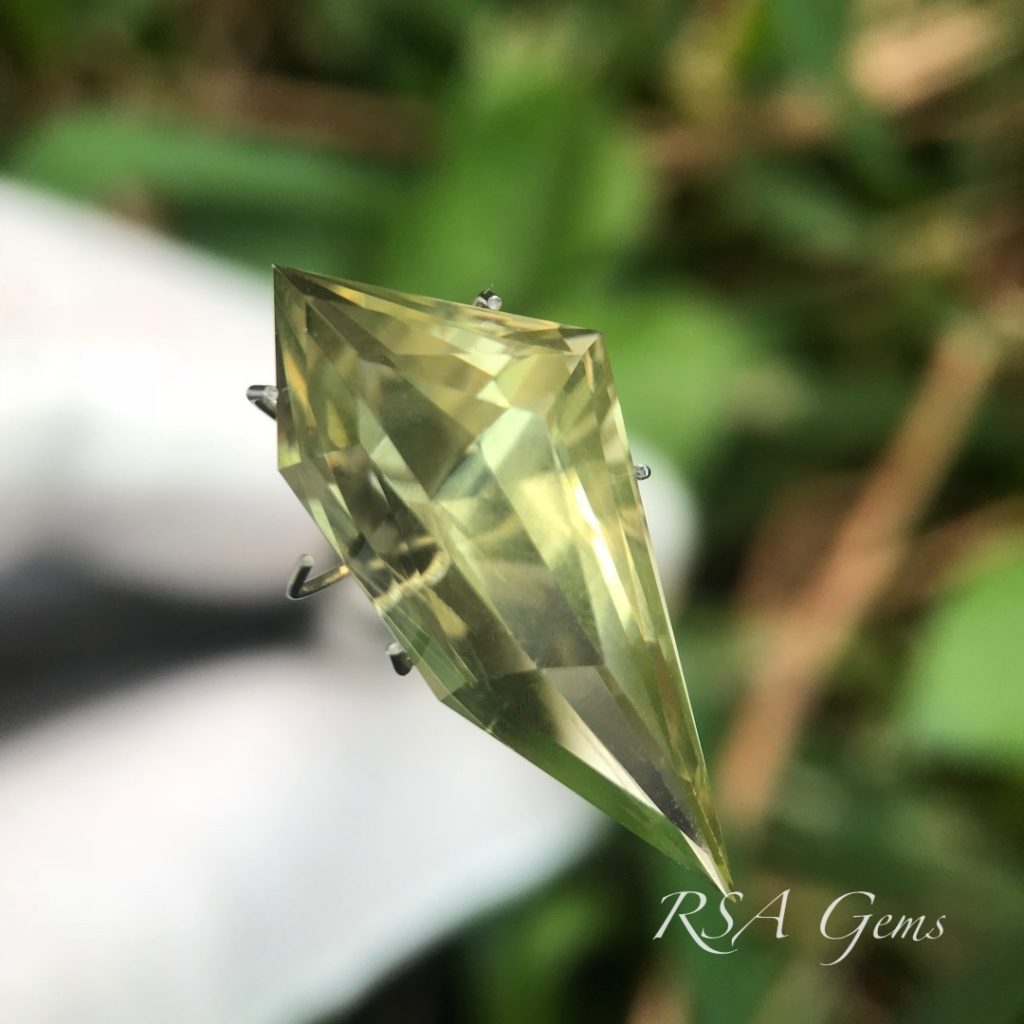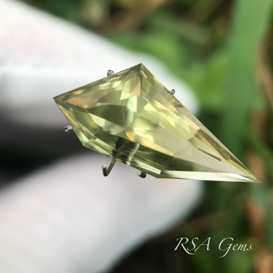 This freeform heliodor was designed by Loren Brown for an unusual shaped piece of rough. Intriguing shape, beautiful stone, but that point is very sharp and will require a custom setting to protect it.