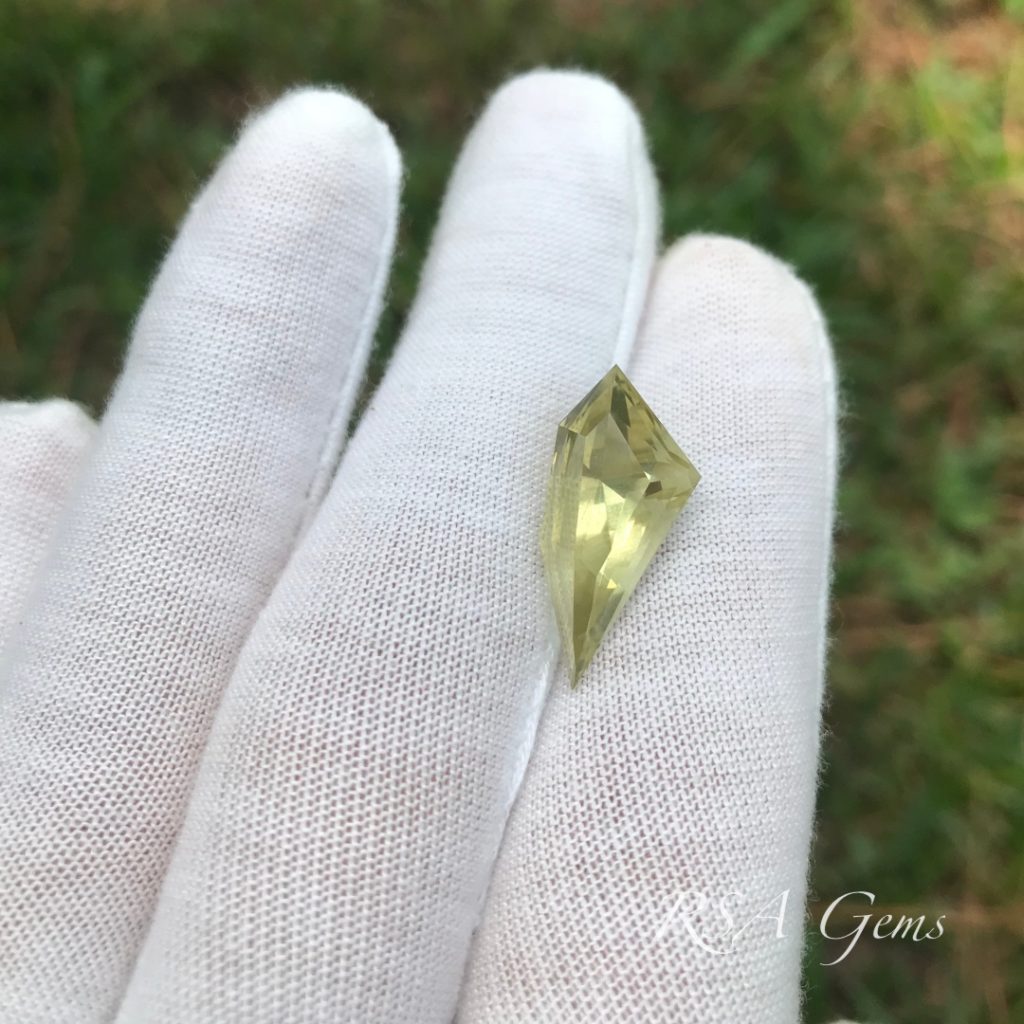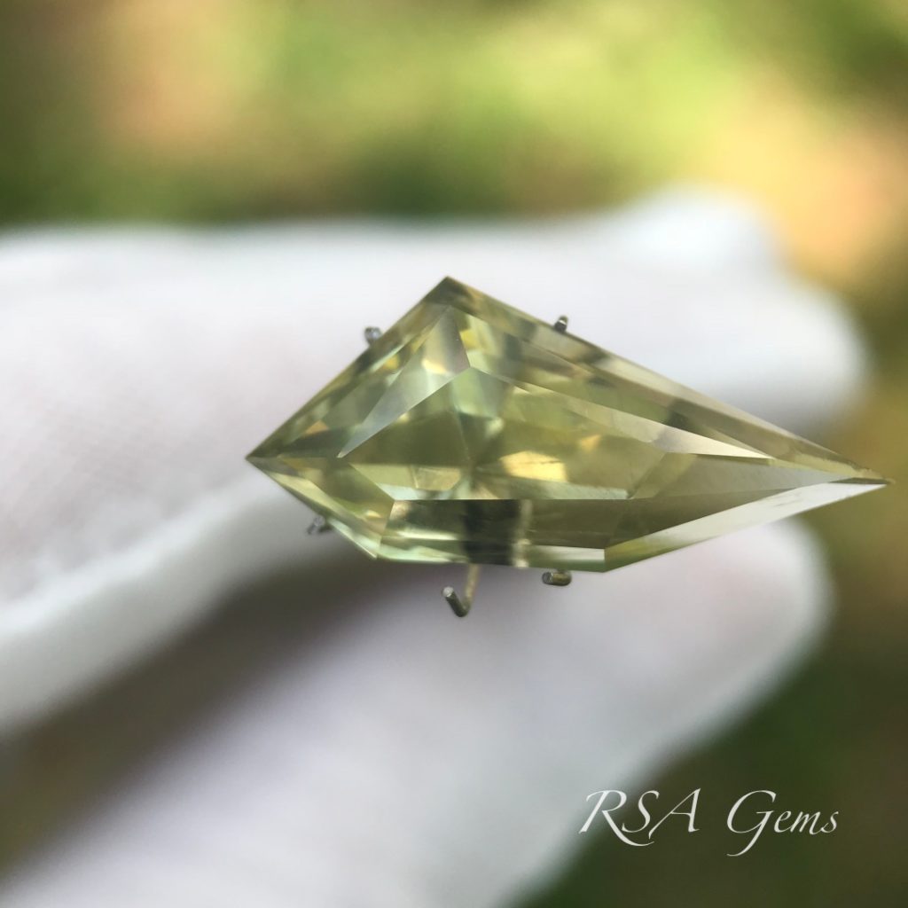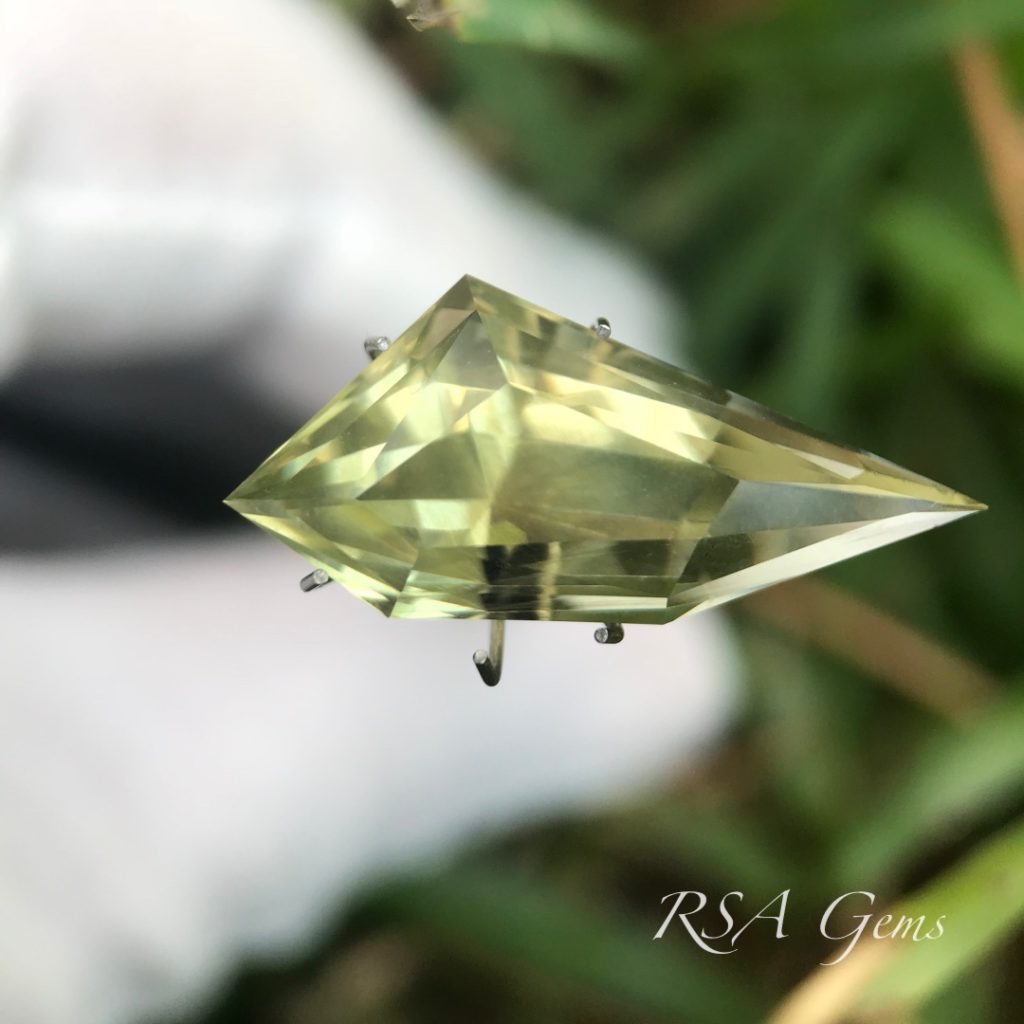This freeform heliodor was designed by Loren Brown for an unusual shaped piece of rough. Intriguing shape, beautiful stone, but that point is very sharp and will require a custom setting to protect it.