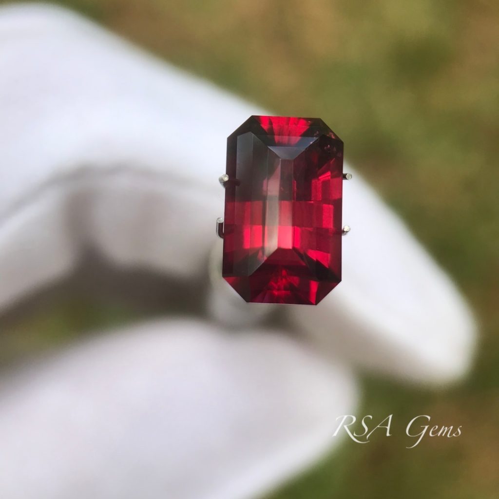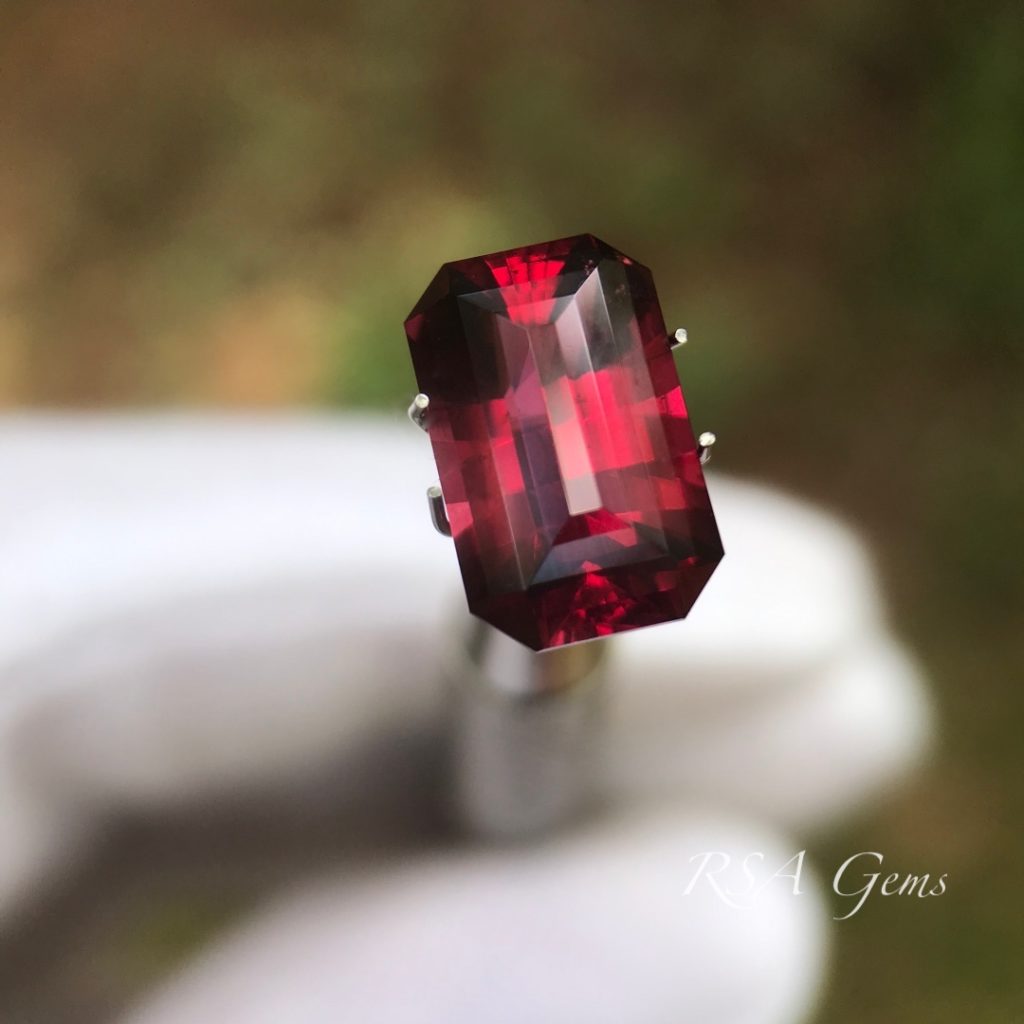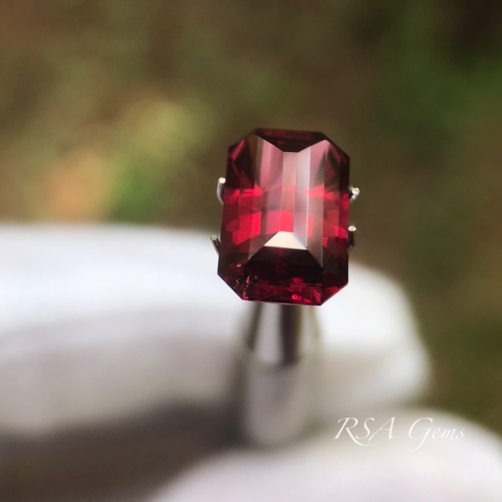 The rough from this garnet came from a friend who owns a mine in Malawi, Africa. Artisanal miners extract the material with hand tools. These garnets contain spessartite, which makes them similar to Malaya garnets. This one is in an original design meant to create a pixelated effect.