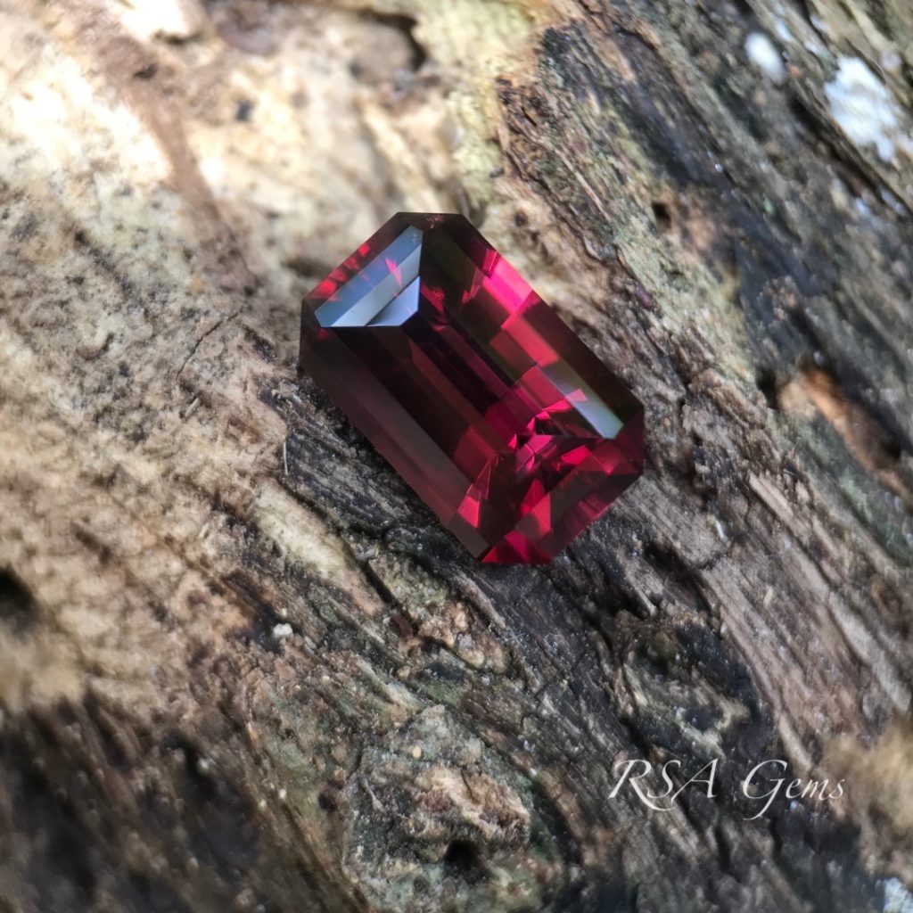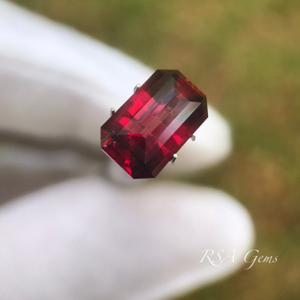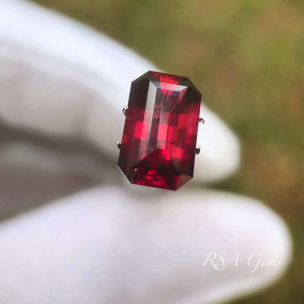 The rough from this garnet came from a friend who owns a mine in Malawi, Africa. Artisanal miners extract the material with hand tools. These garnets contain spessartite, which makes them similar to Malaya garnets. This one is in an original design meant to create a pixelated effect.
