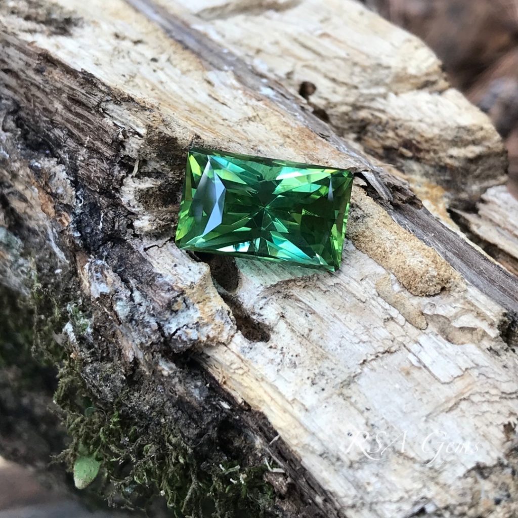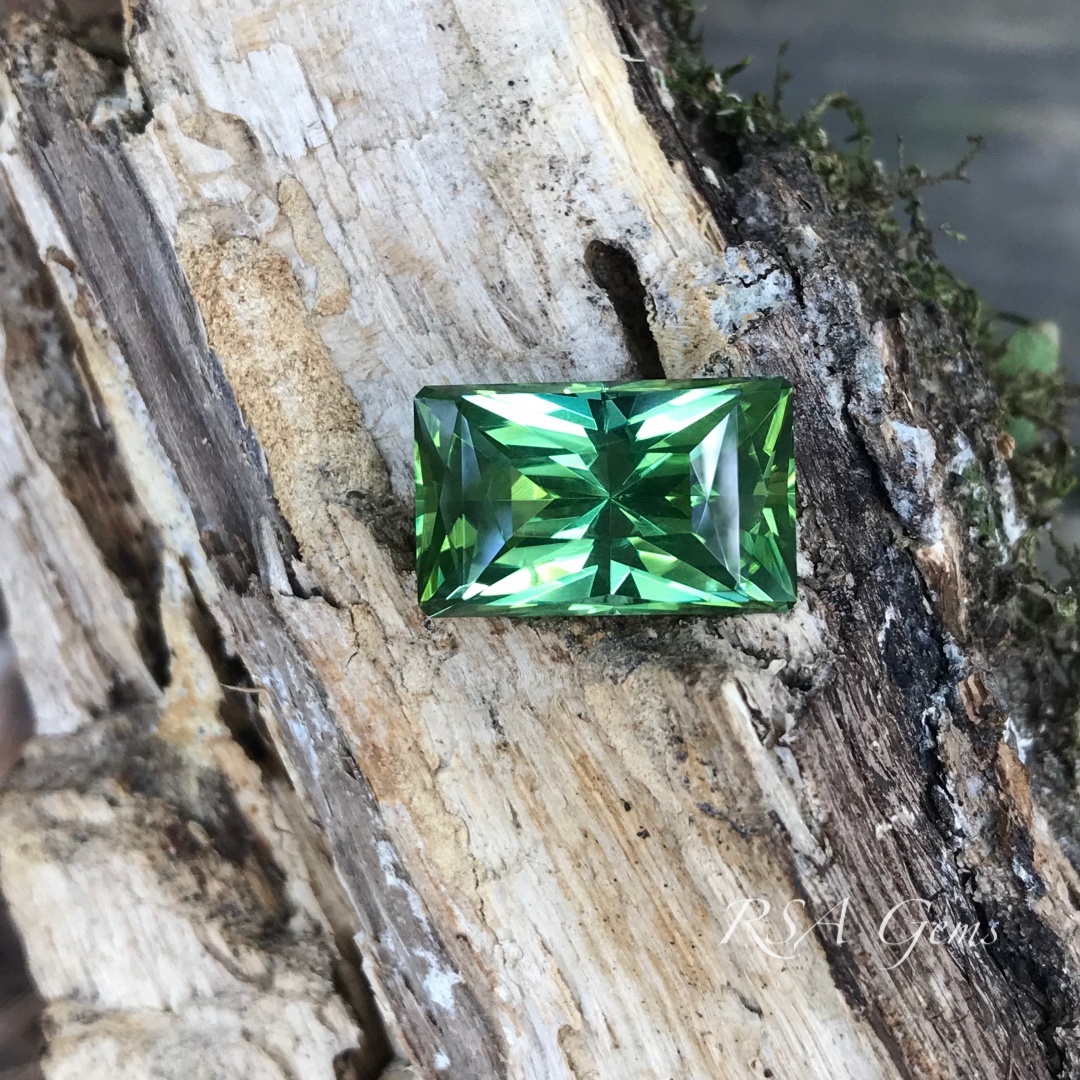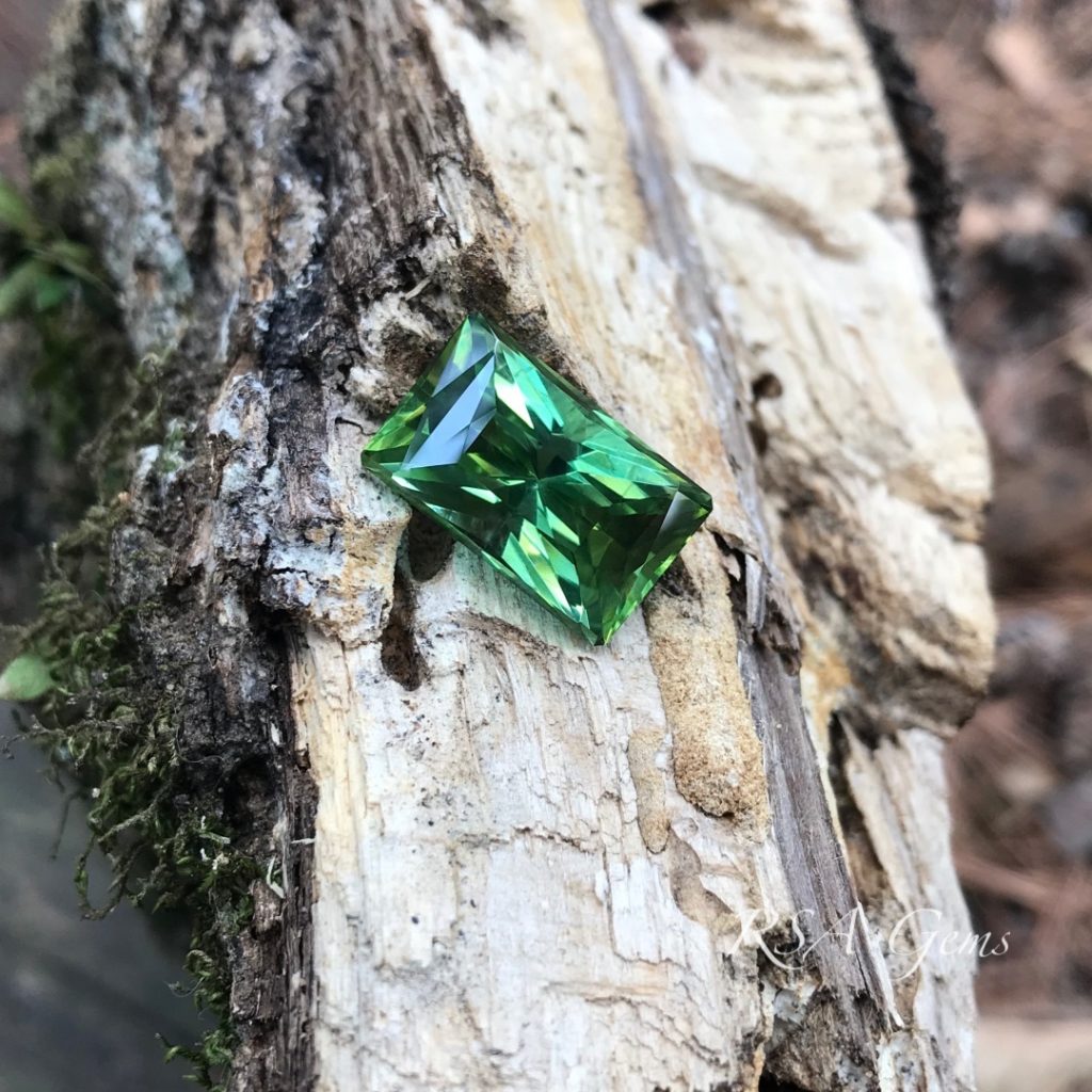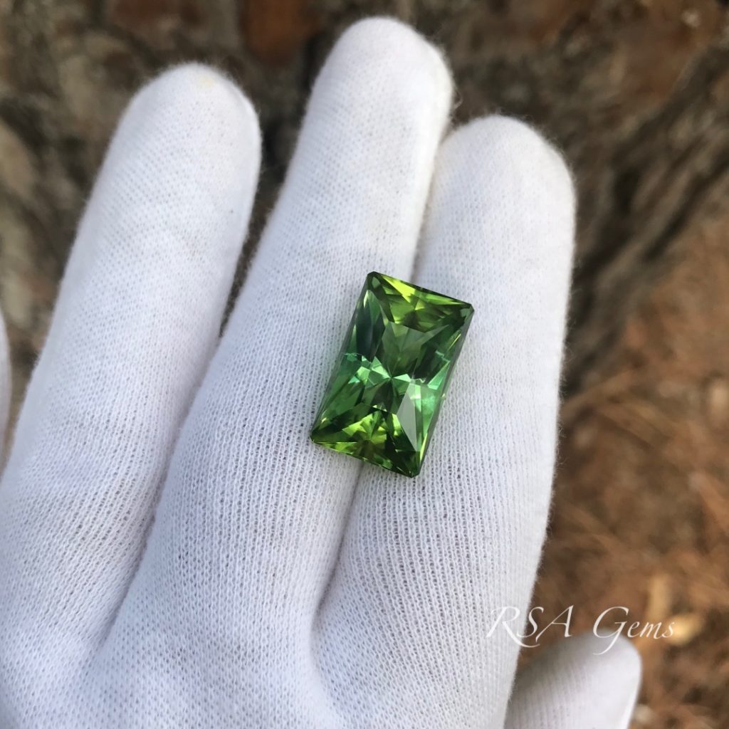 This is a beautiful, large mint green blue tourmaline, cut in an original design called “Firebird.” The facet rough came out of the ground earlier this year in Congo, which has some of the most beautiful tourmalines.