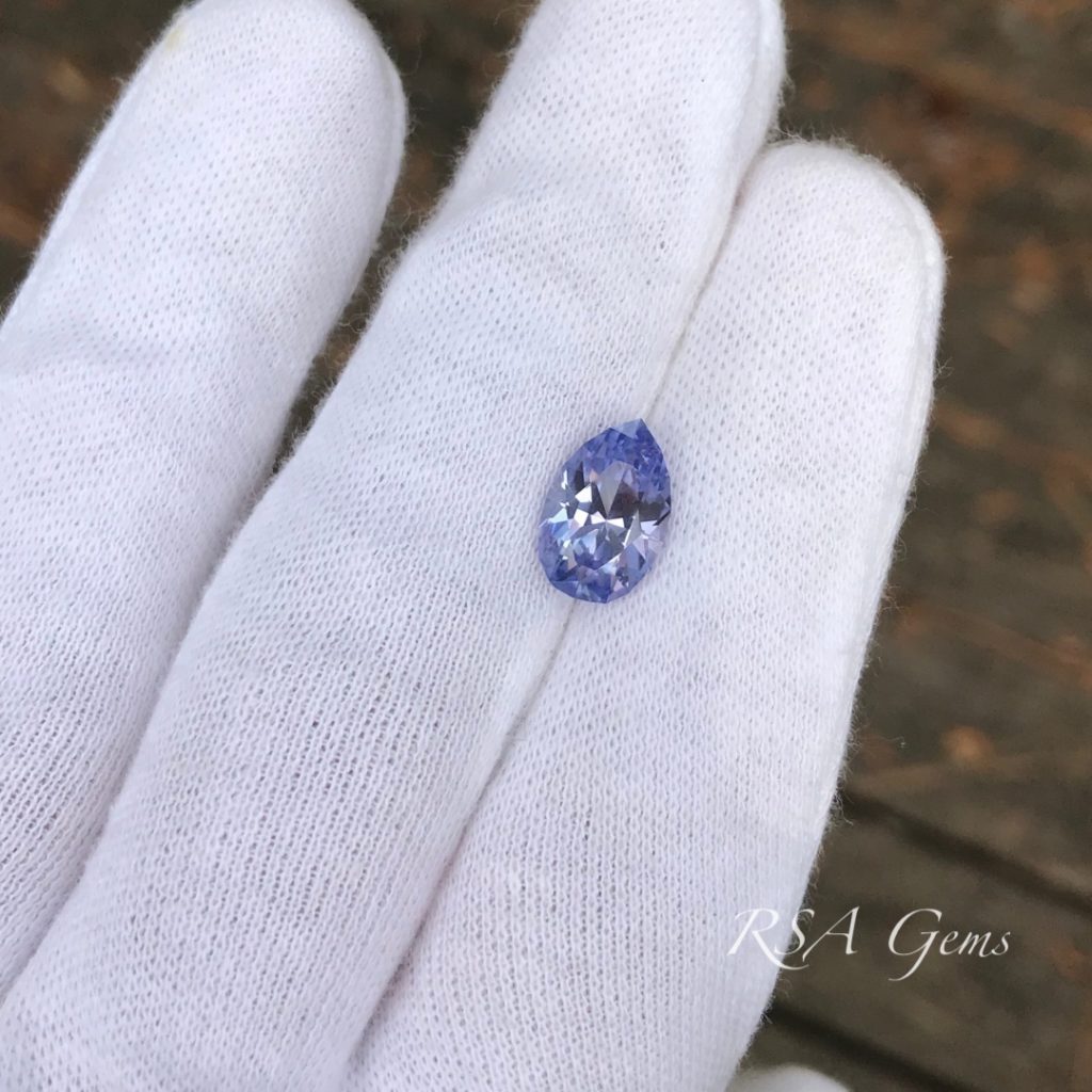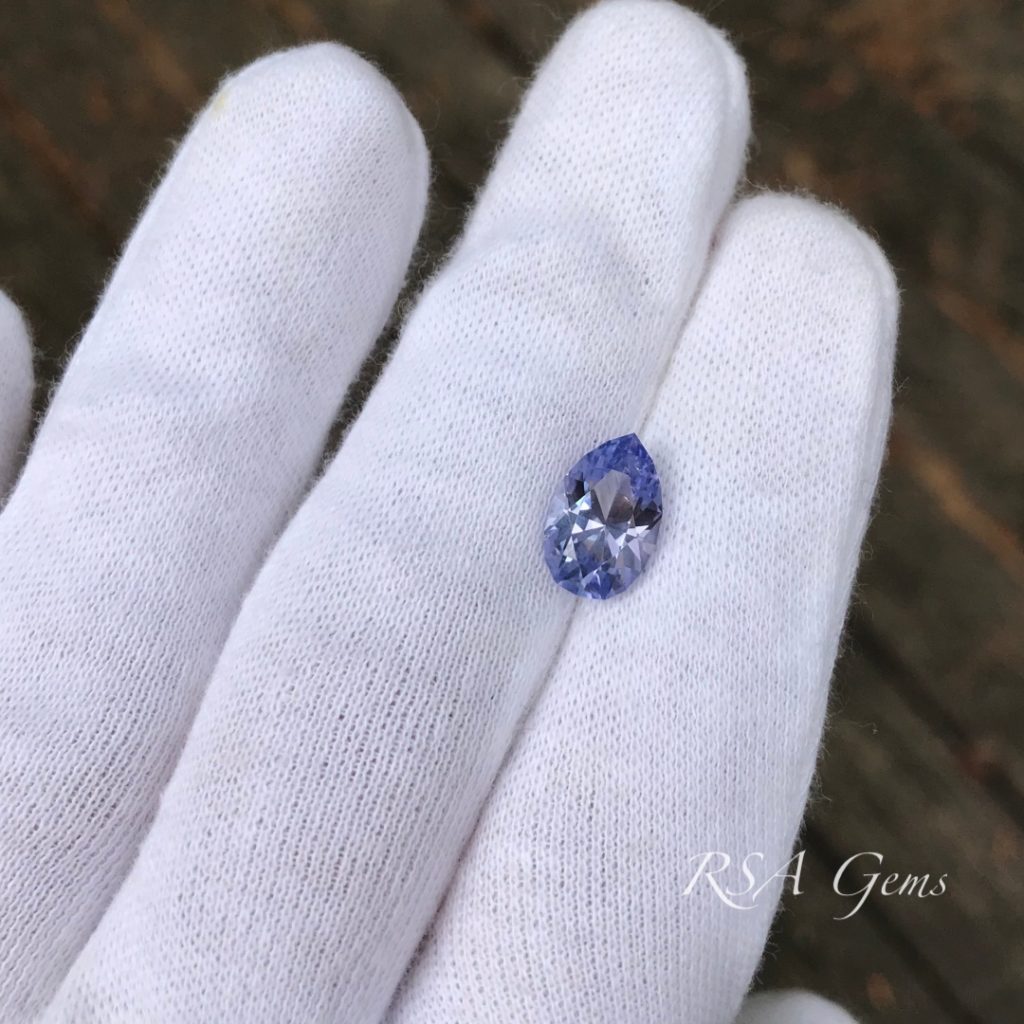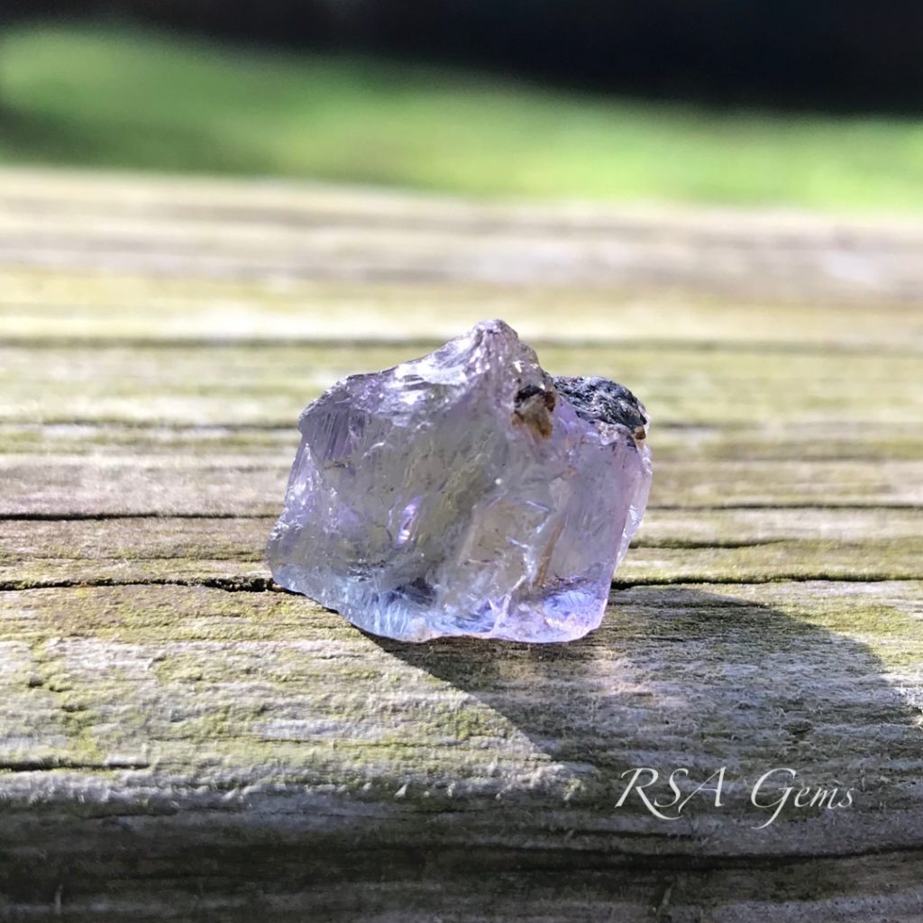 This lavender tanzanite (upon inspection it is light purple and blue) has been heated. There are photos of the rough and cut stone here for reference.
