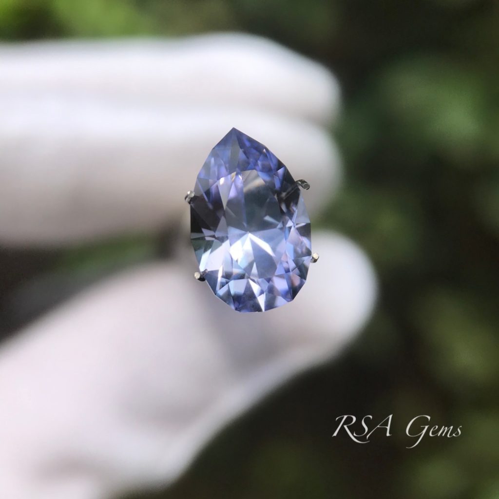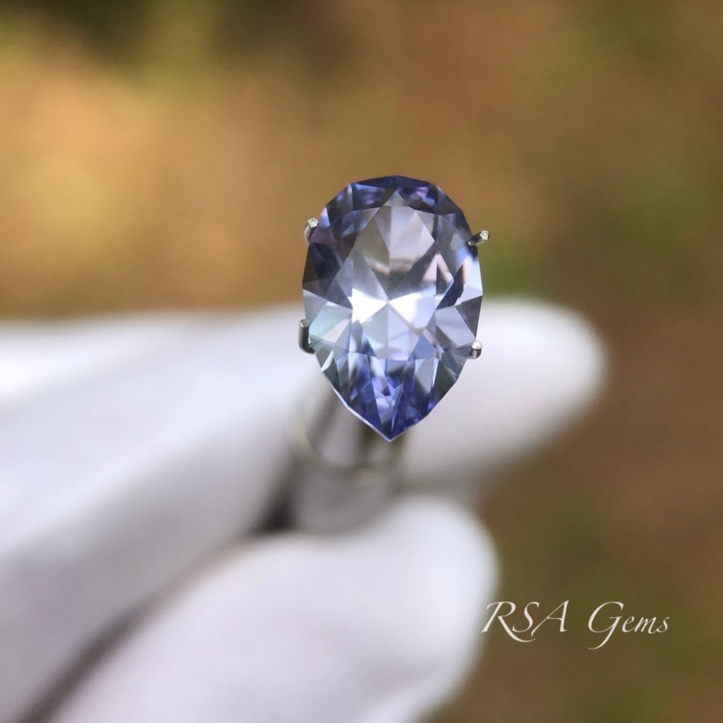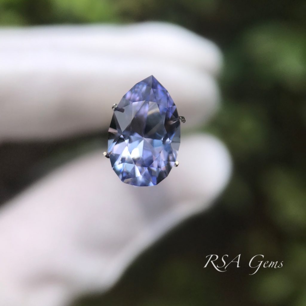 This lavender tanzanite (upon inspection it is light purple and blue) has been heated. There are photos of the rough and cut stone here for reference.