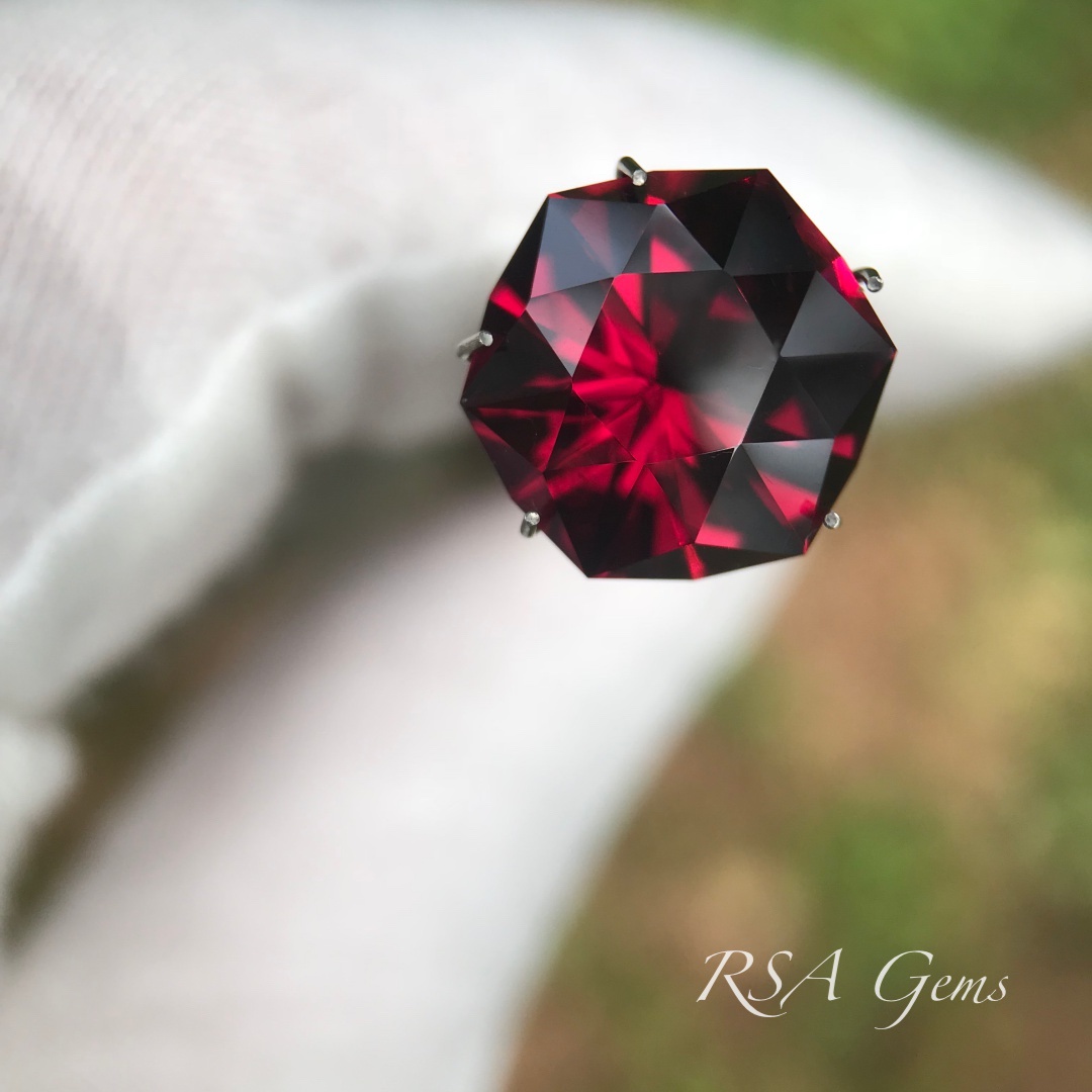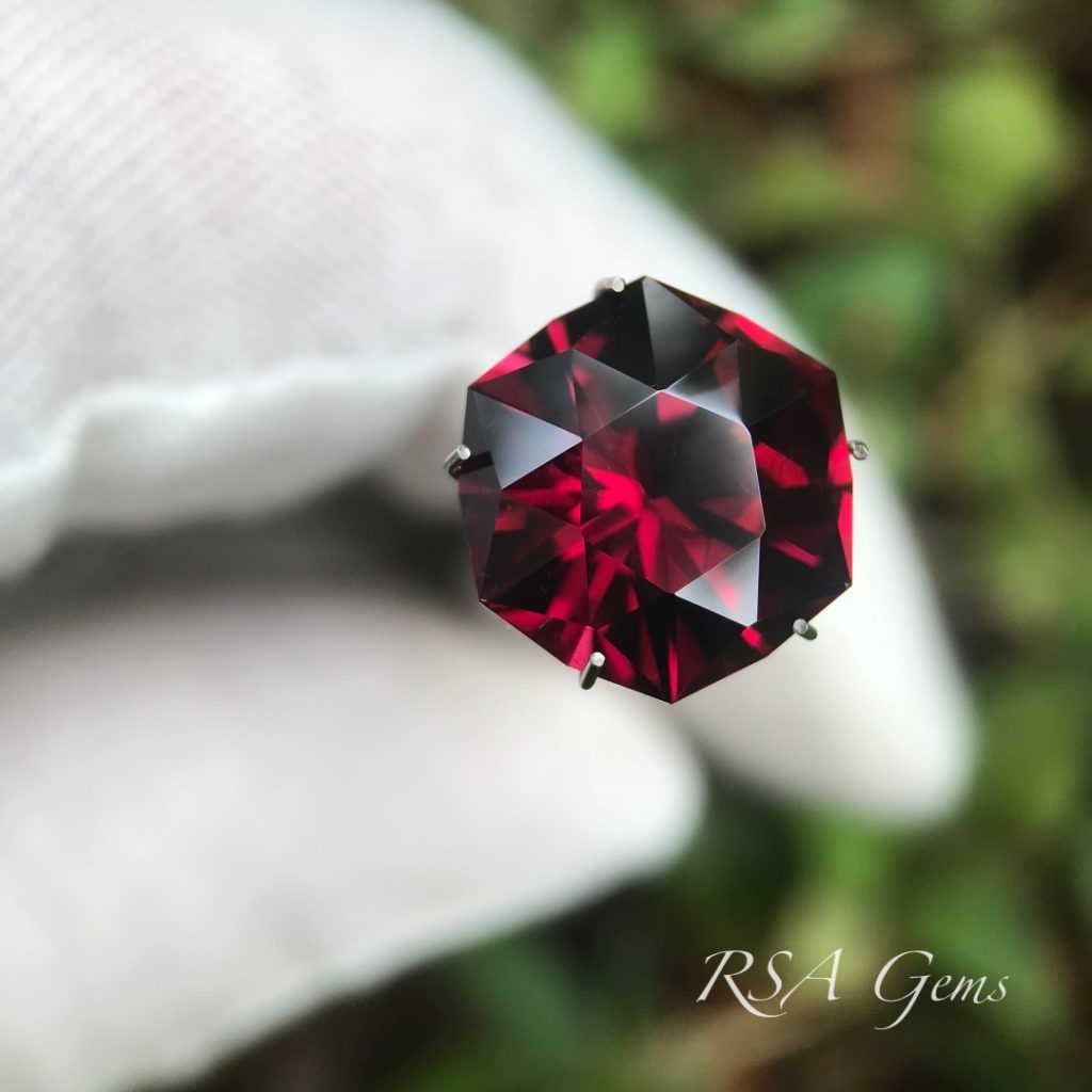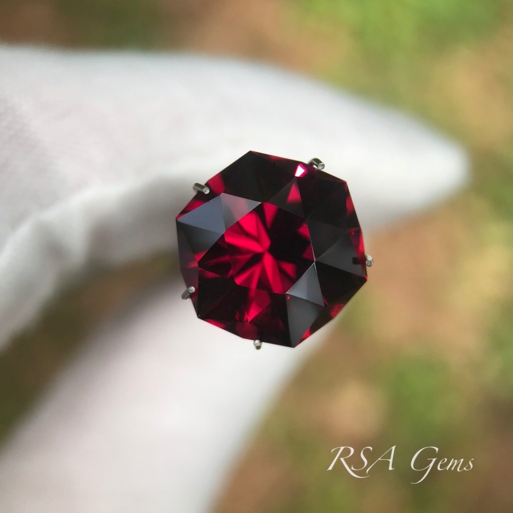 This beautiful Malawi garnet is a strong purplish red color with some pink flashes because it contains spessartine, pyrope and almandine garnet types. We obtain the rough Malawi garnets directly from the mine owner. Loren cut this stone in a hexagon design called Fritillaria by Marco Voltillini.