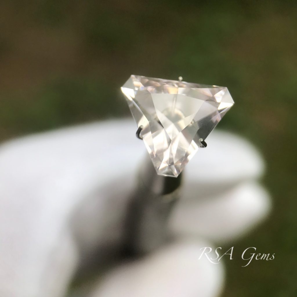 This flashy morganite triangle cut will make someone very happy. Not too big, not too small, this pink beauty originates from Nigeria.We had to cut the morganite rough in two pieces to make it work.