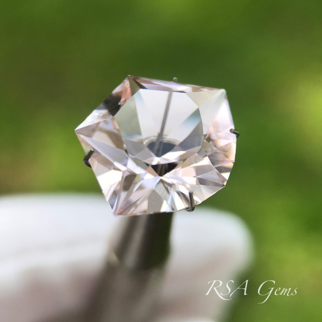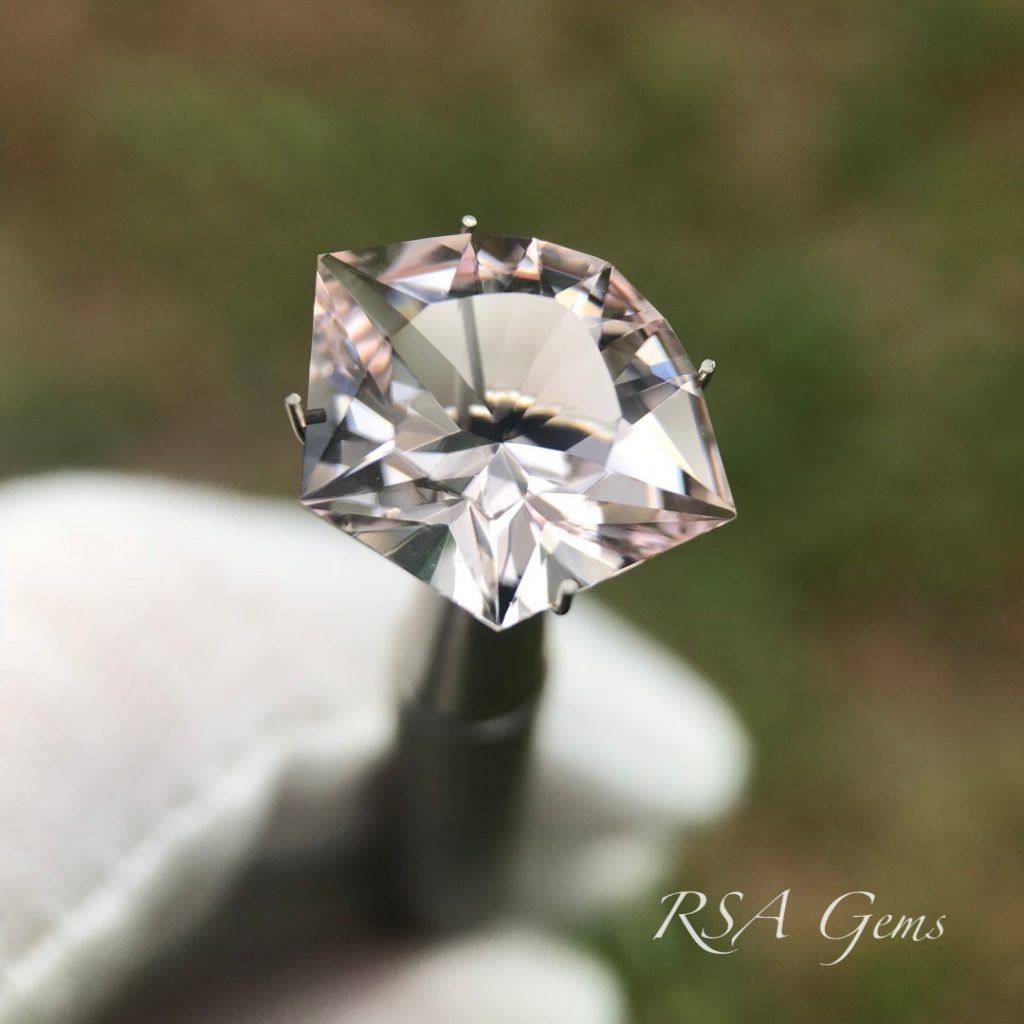 Here is a light pink morganite fan from Nigeria, Africa. Morganite is a type of Beryl, related to Aquamarine and Emerald. Morganite is usually very pastel as is this stone. It looks very nice in subdued light (shade or low-light indoors).