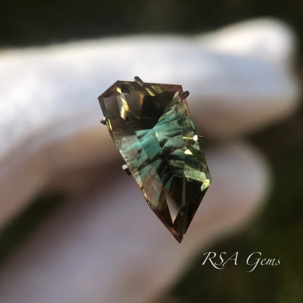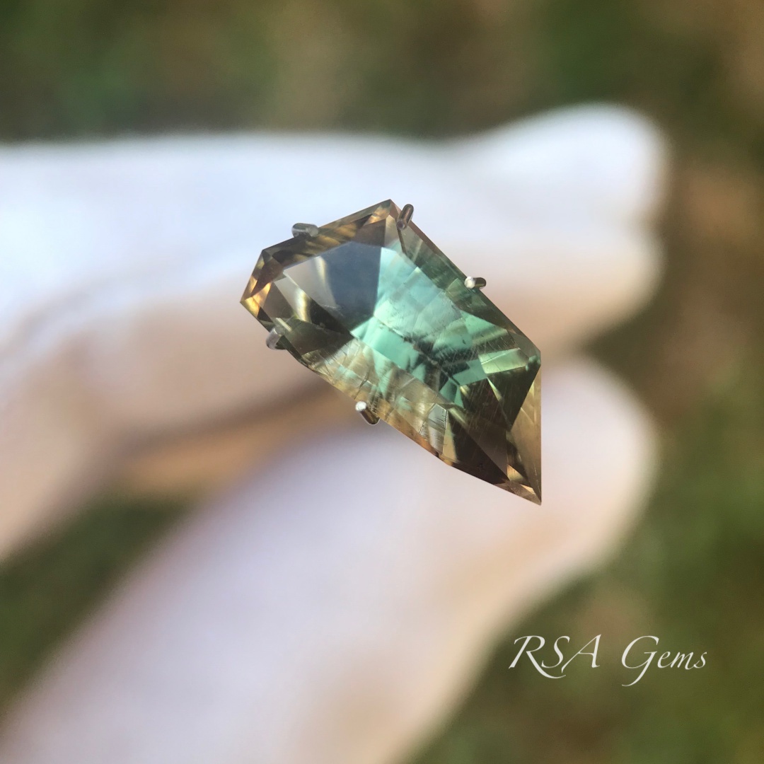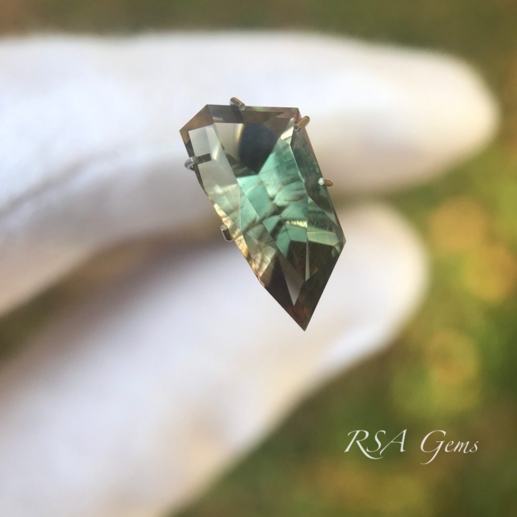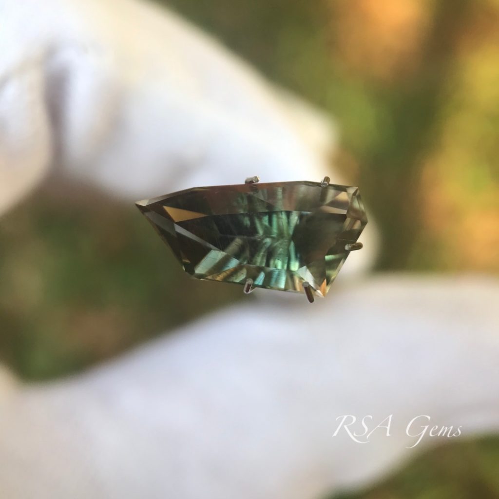 Green Oregon Sunstone cut in an original design.