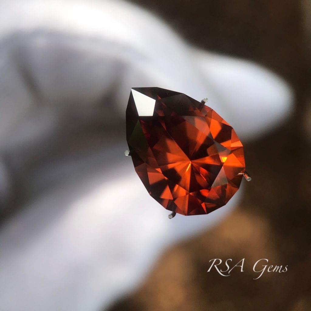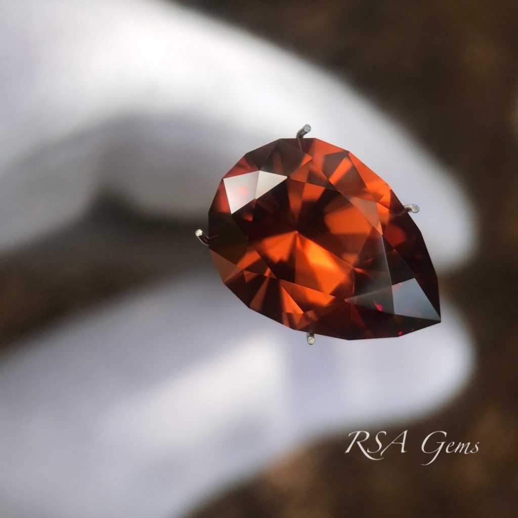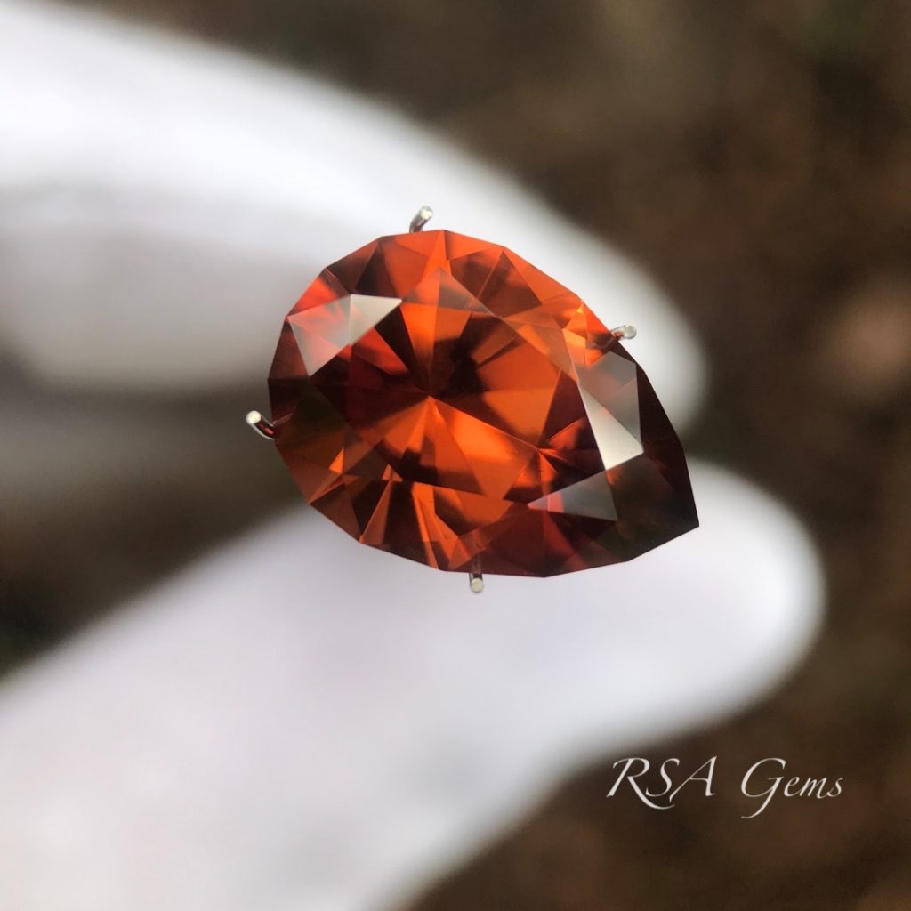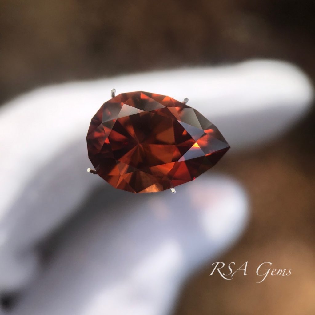 Gorgeous, eye clean zircon, originally mined in Tanzania, precision cut in a pear design by Loren Brown. This stone has a rich reddish orange color with lots of sparkle.