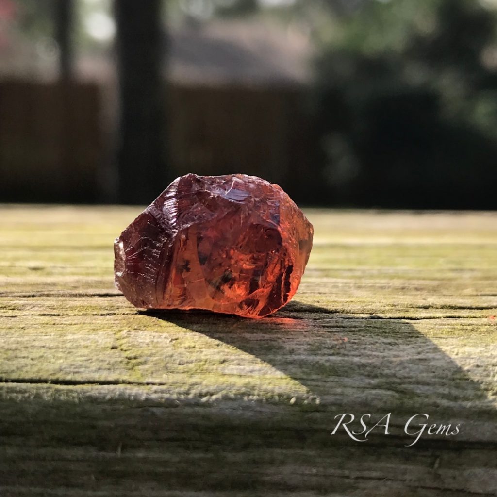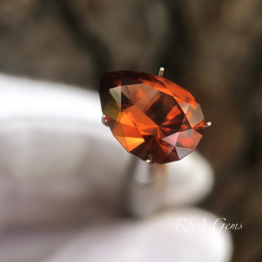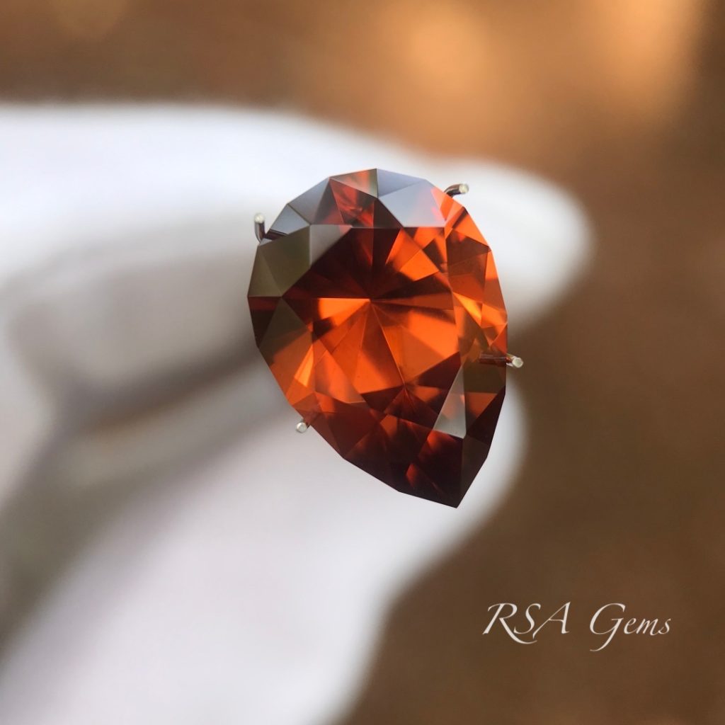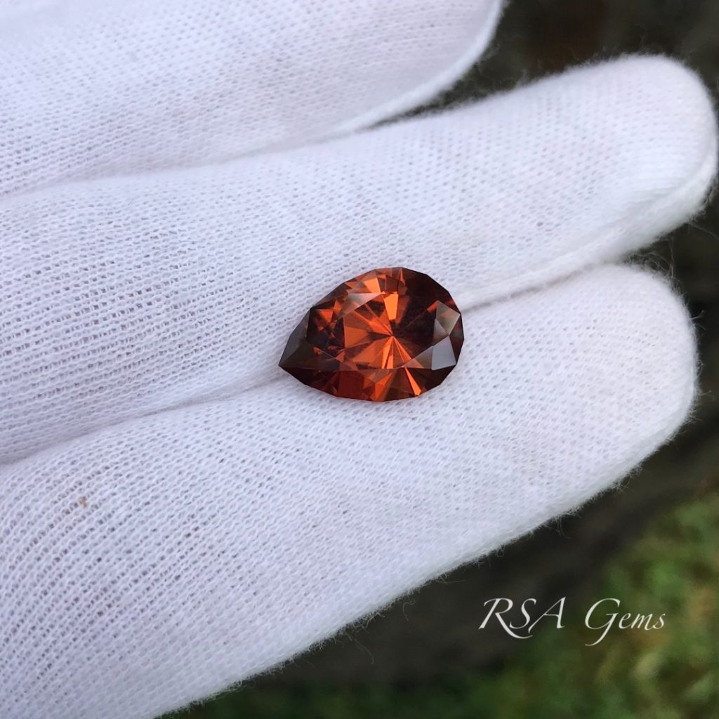 Gorgeous, eye clean zircon, originally mined in Tanzania, precision cut in a pear design by Loren Brown. This stone has a rich reddish orange color with lots of sparkle.