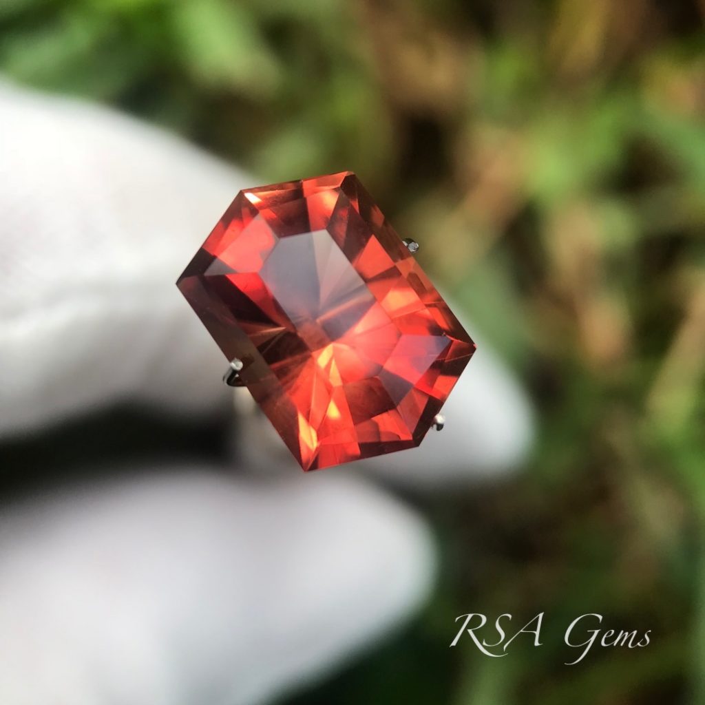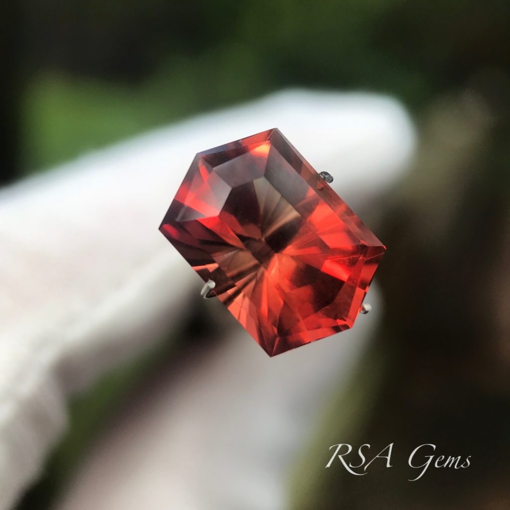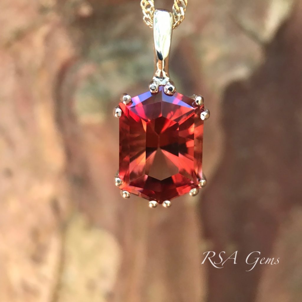 This beautiful red Oregon Sunstone is from Little Eagle Butte, cut by Loren Brown in an original pattern.