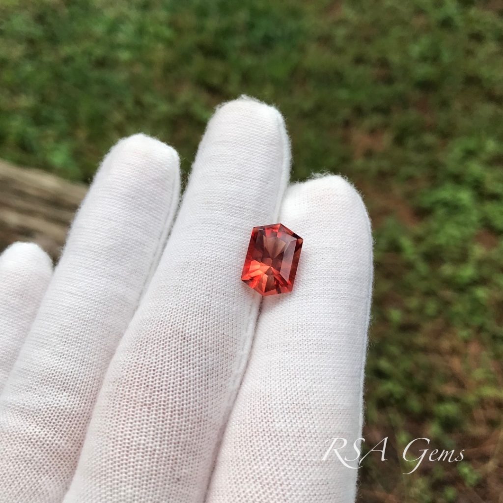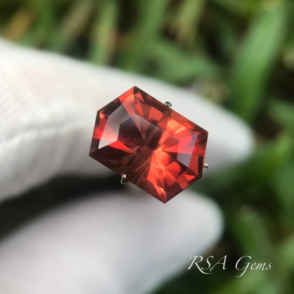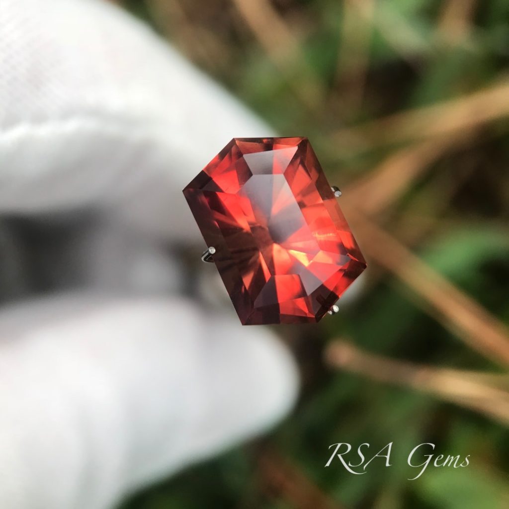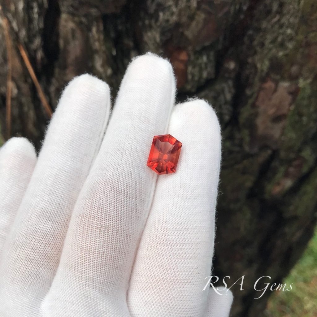 This beautiful red Oregon Sunstone is from Little Eagle Butte, cut by Loren Brown in an original pattern.