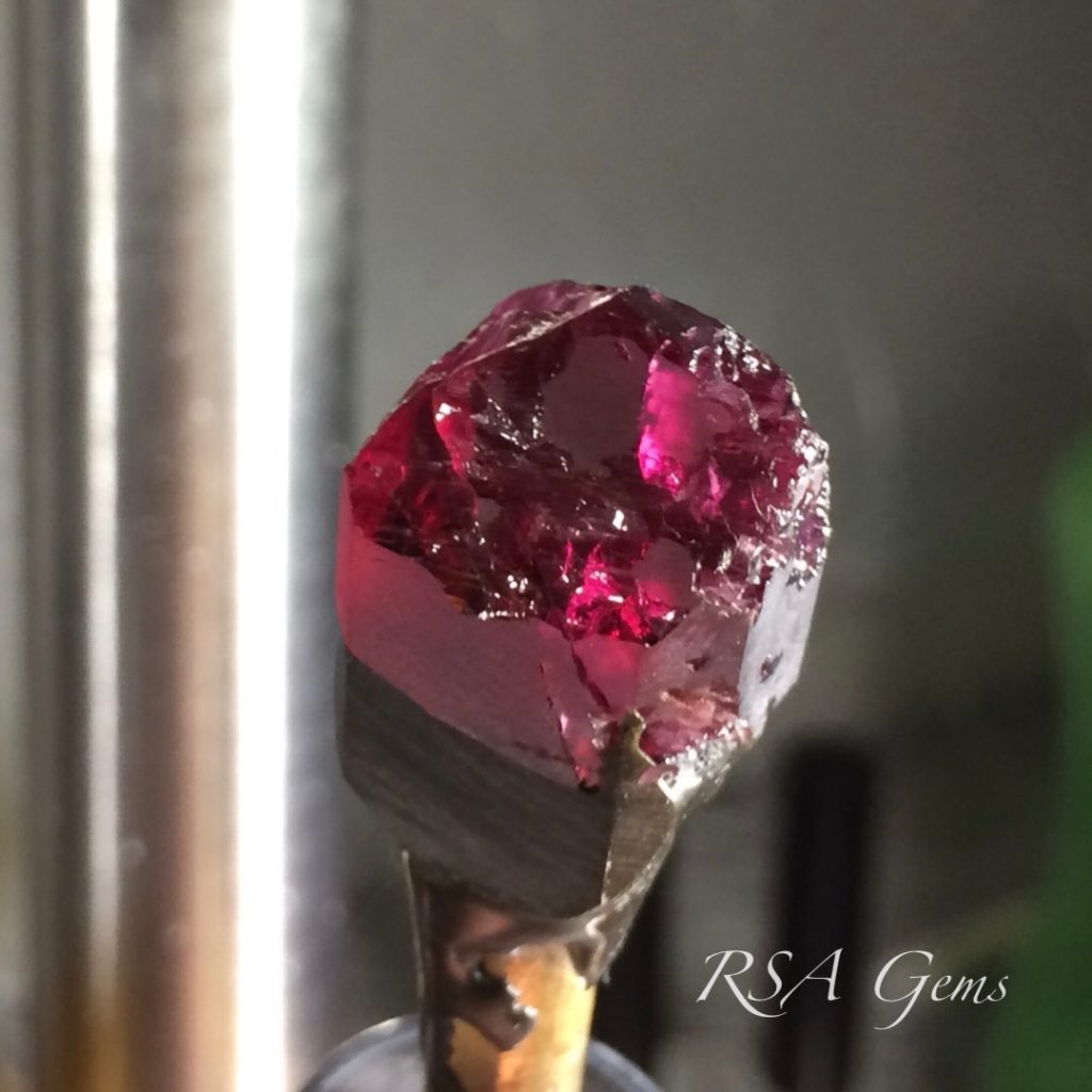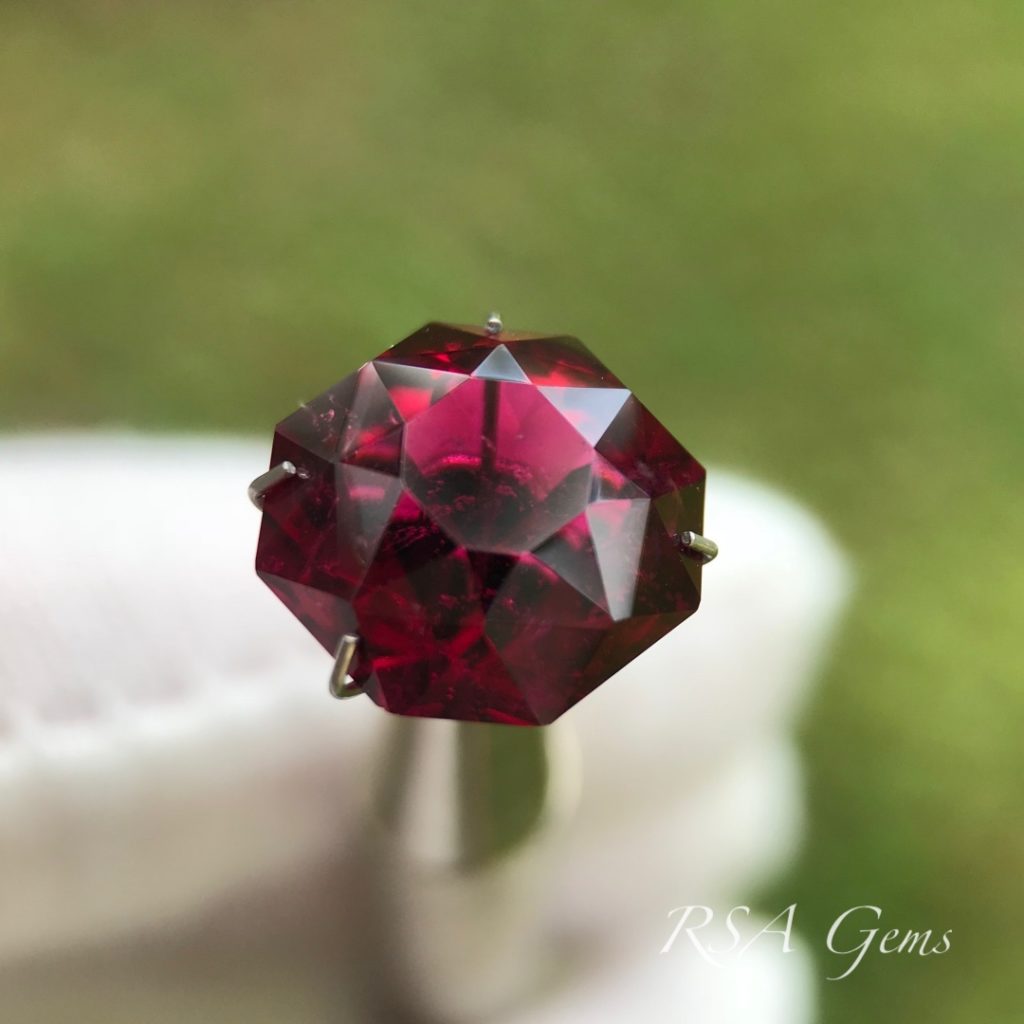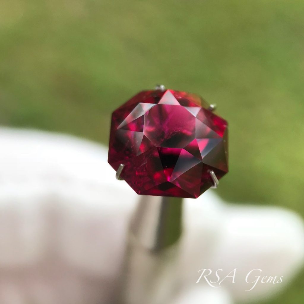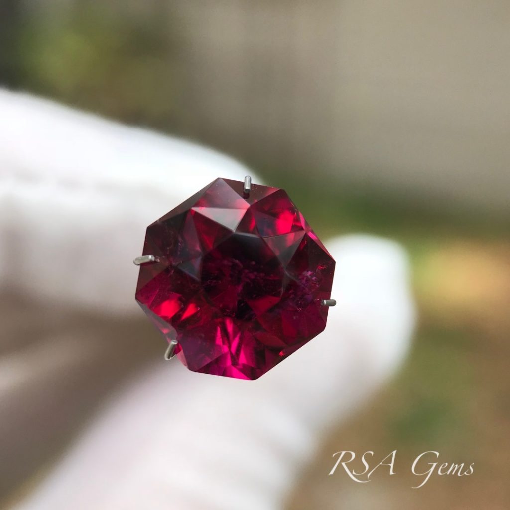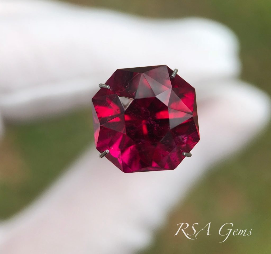 Rubellite is the red variety of tourmaline. This stone is a top-color, deep vivid red. The color is highlighted by the double-layer of crown facets in this design. Tourmaline is always dichroic, and Rubellite is no exception. This stone displays vivid pink flashes as a result of dichroism. Here lies a stunning alternative to the more expensive Ruby (and you cannot tell the difference without scientific investigation).