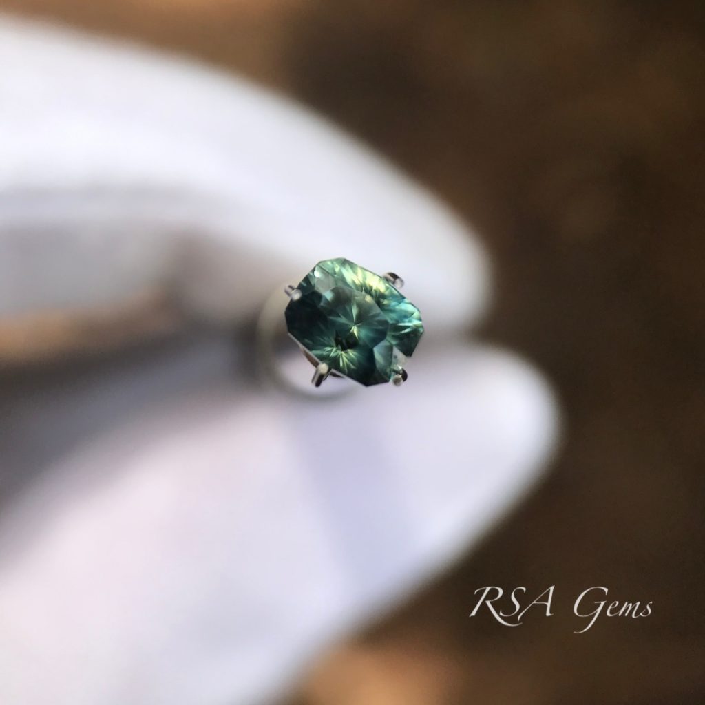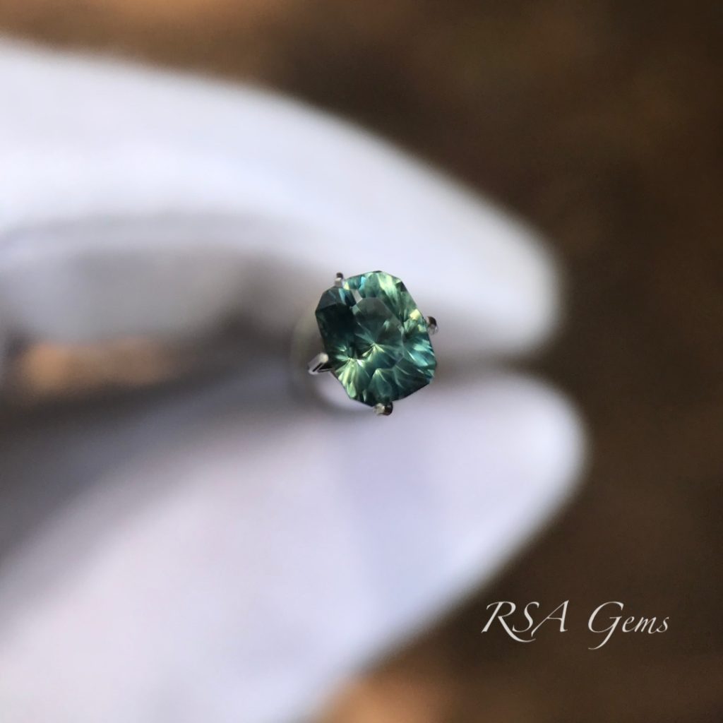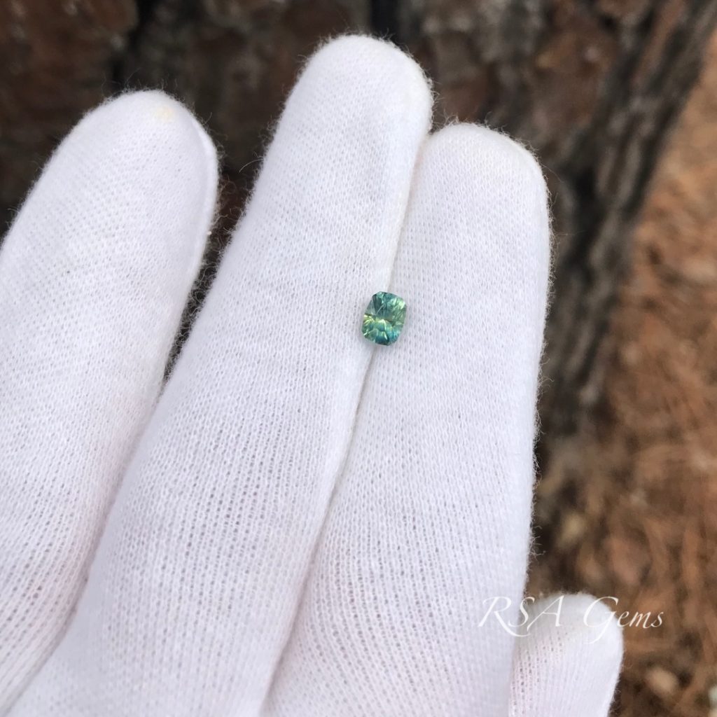 This sapphire came from the same rough as our much larger yellow sapphire listed here. It is yellow and blue, and they have mixed somewhat to show a greenish hue with a hint of yellow and some blue. Pretty stone with high brilliance.