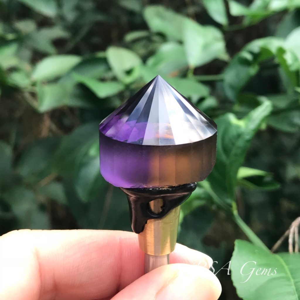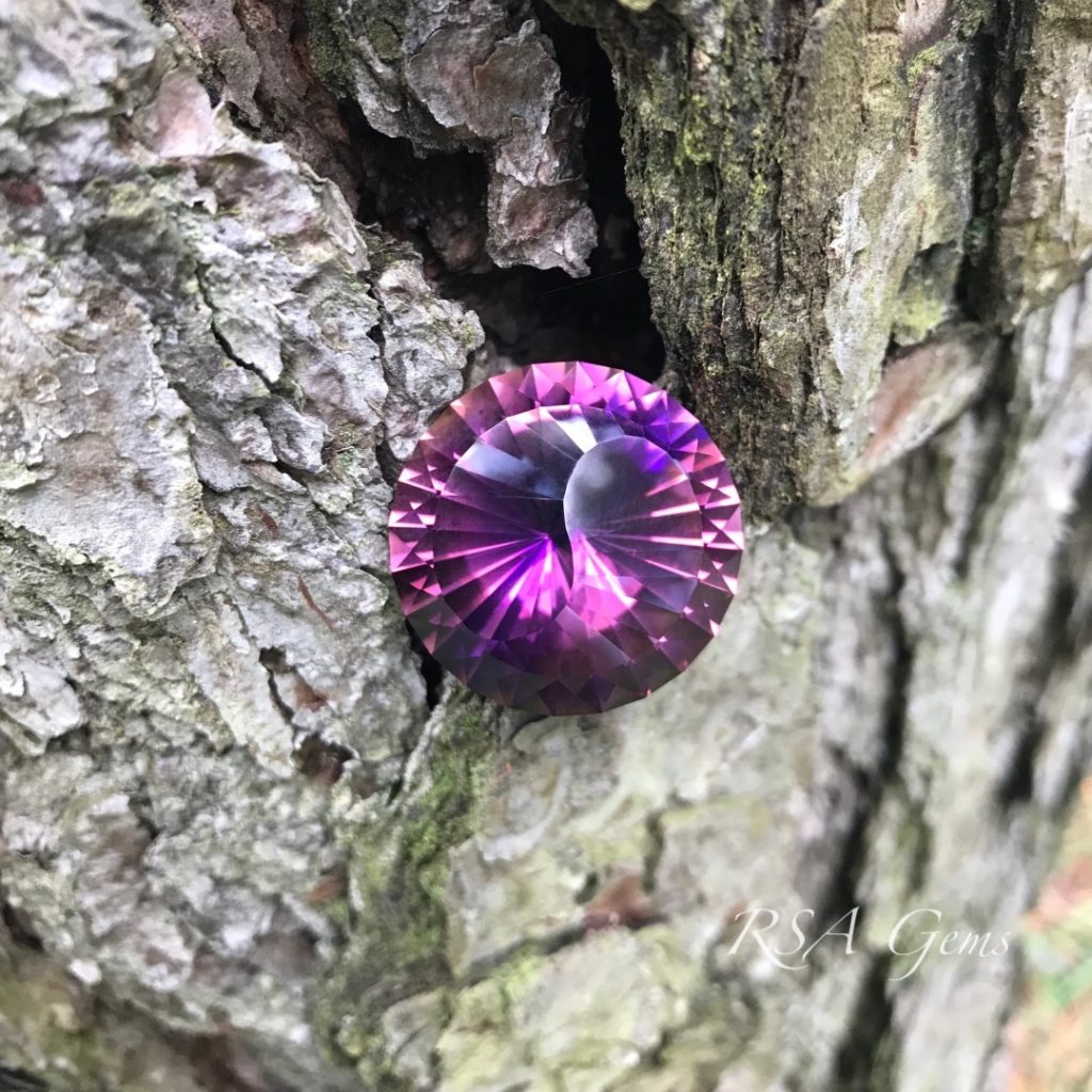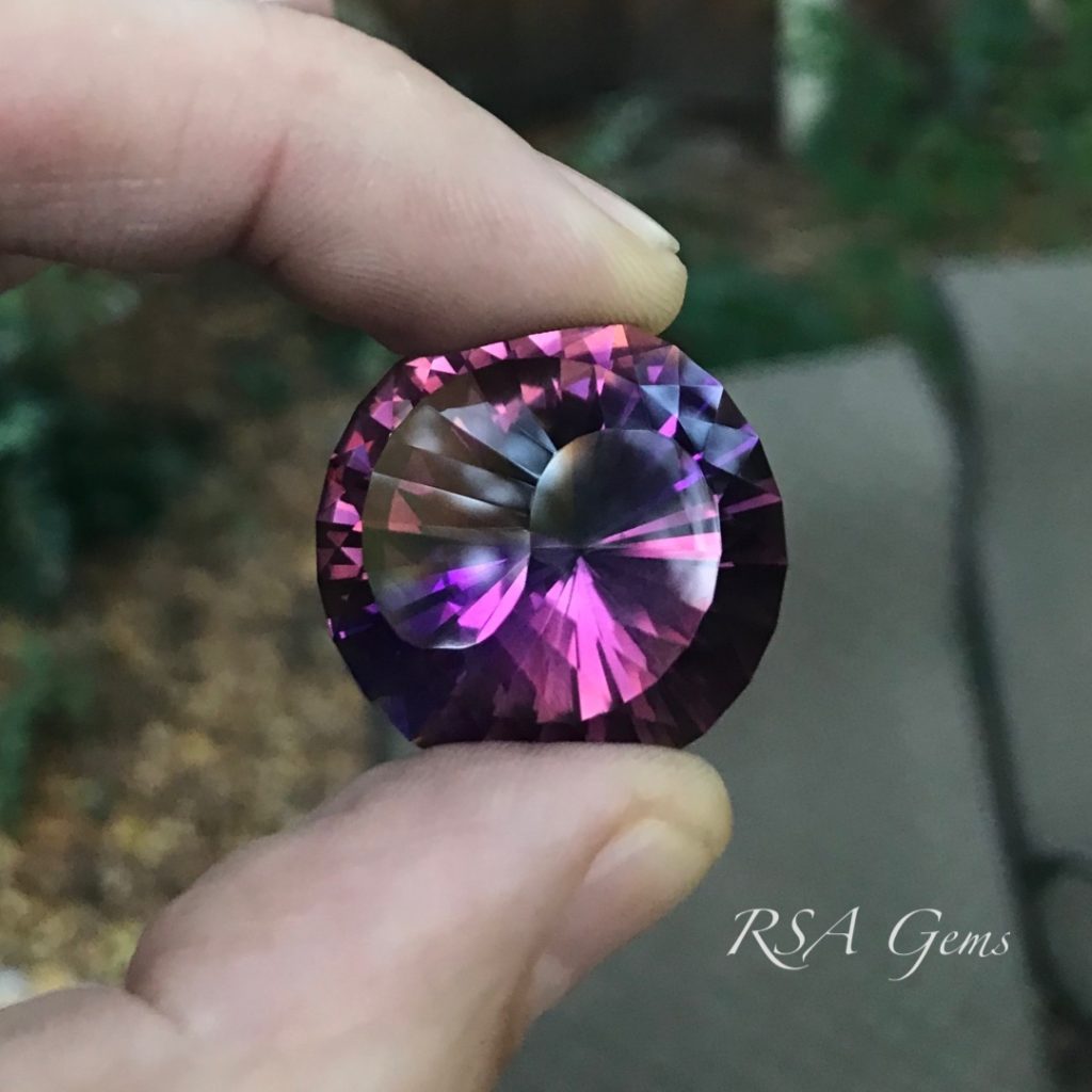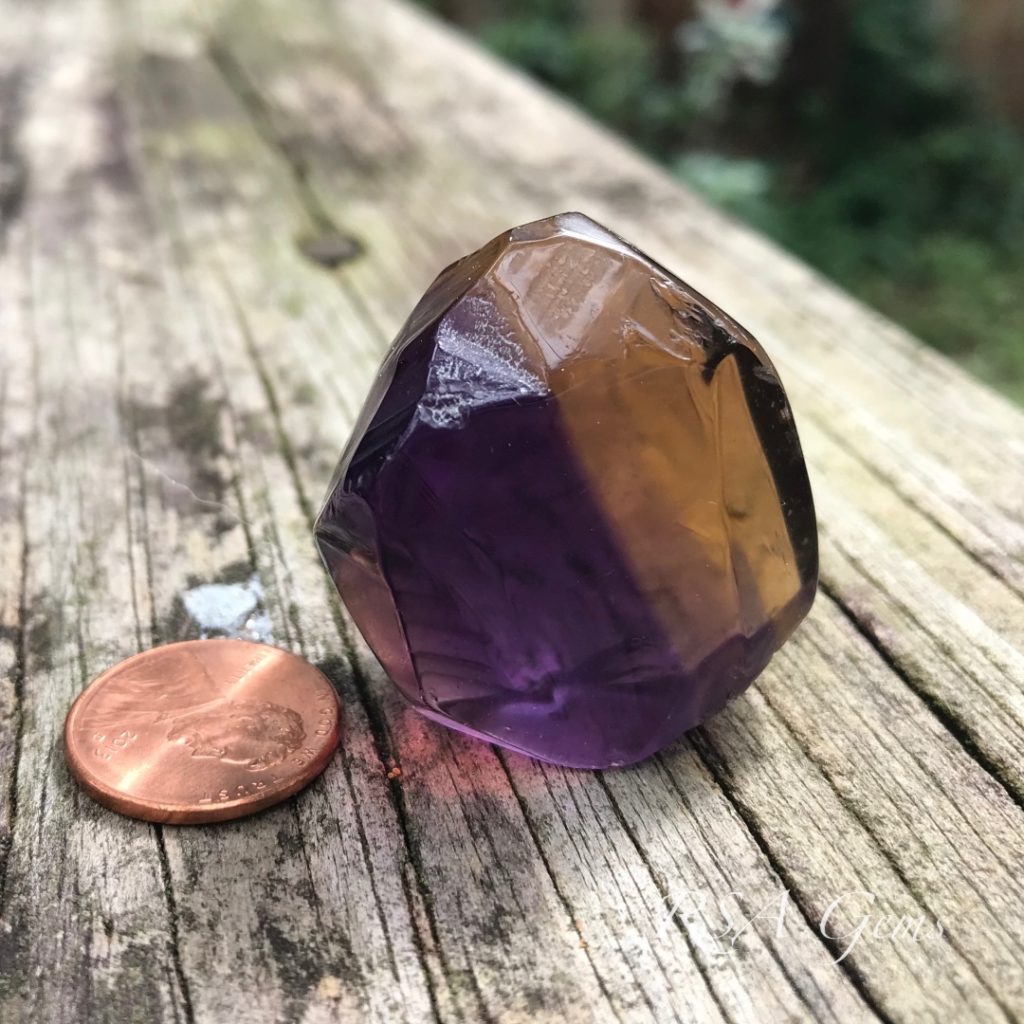 This is a collector Yin Yang Ametrine that is huge! More than an inch in diameter, this stone blends the Amethyst (February birthstone) with the Citrine (November birthstone) to create a pretty blend of colors. The rough (see photos) was obtained from the Anahi mine in Bolivia, the world’s largest natural ametrine mine. The colors change somewhat with viewing angle, it would look great on a revolving platform. The pattern was written by Loren Brown, and was inspired by a similar gemstone cut by Spectrum Award winner, Victor Tuzlukov.